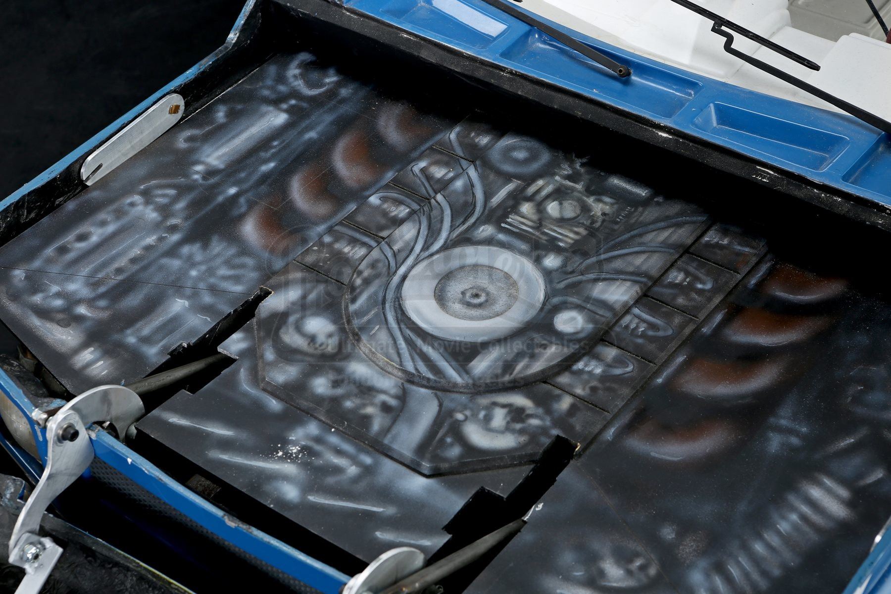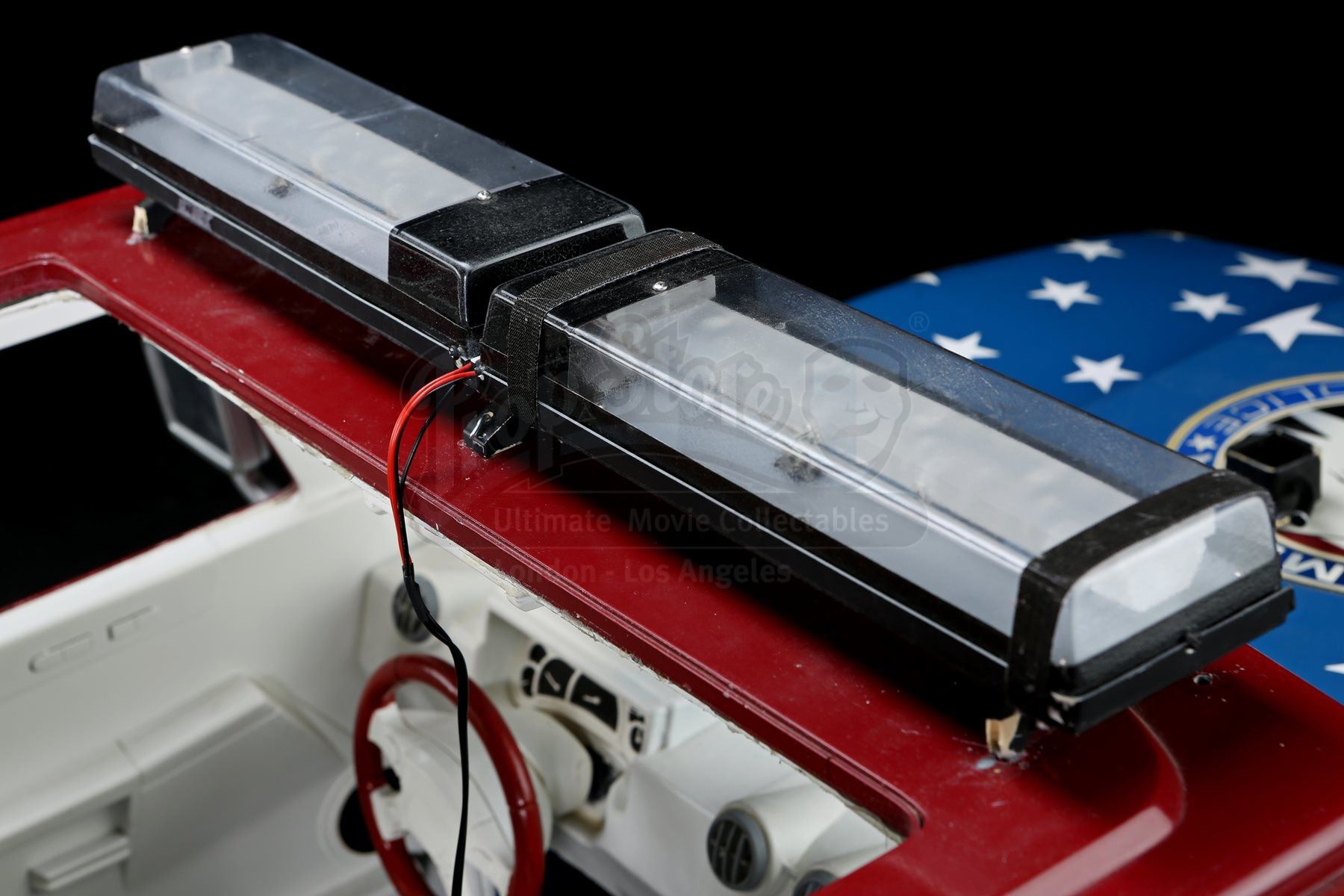 Numerous modifications are present on the outside of the vehicle, including resin rockets, resin thrusters and a functioning set of emergency lights, which are powered via a 9-volt battery. The bonnet opens to reveal a ramp that was deployed when the team needed to send an enemy car over the Hummer. This ramp is made of resin. Additionally, the vehicle’s grille houses two hidden machine guns. These were originally deployed via mechanisms that have been removed. As a result, the guns must now be revealed manually. The piece shows some wear to the outside, including scratches throughout and missing rockets, but remains in fine overall condition. Dimensions: 178 cm x 85.5 cm x 79 cm (70” x 34” x 31”)