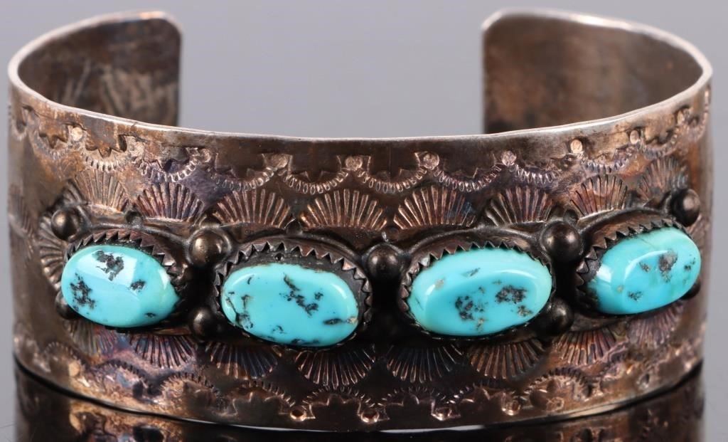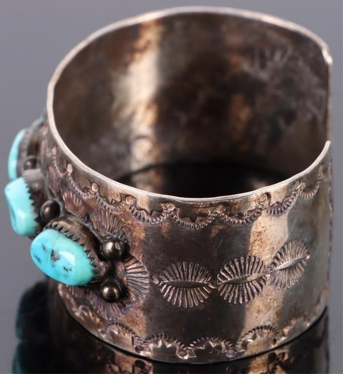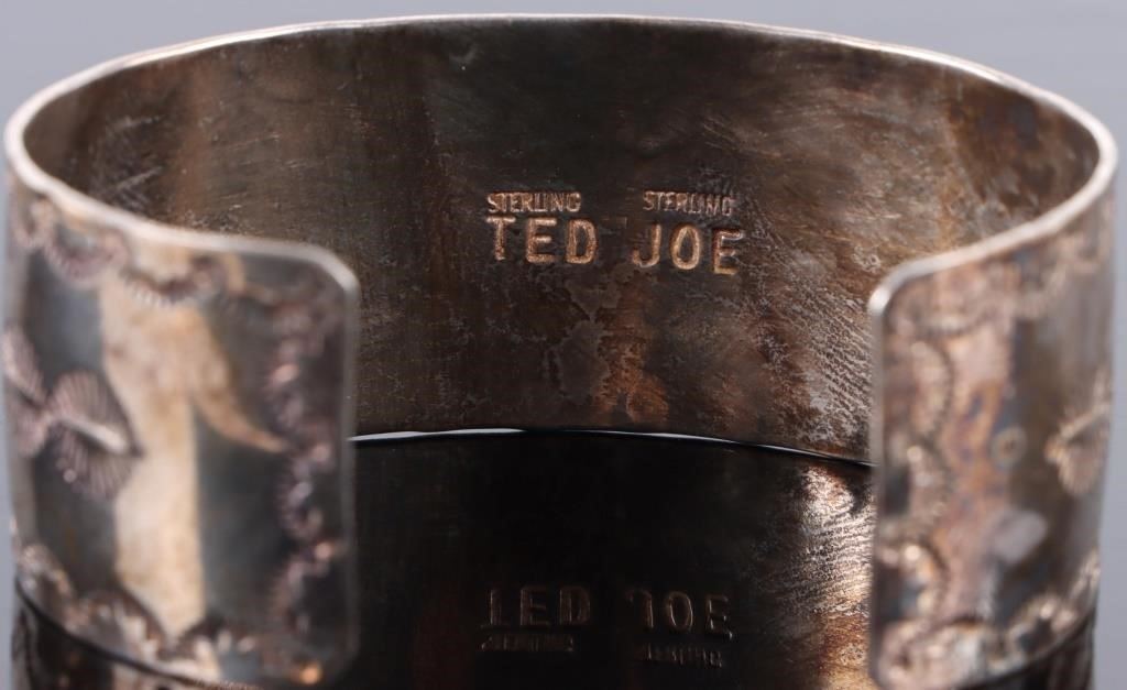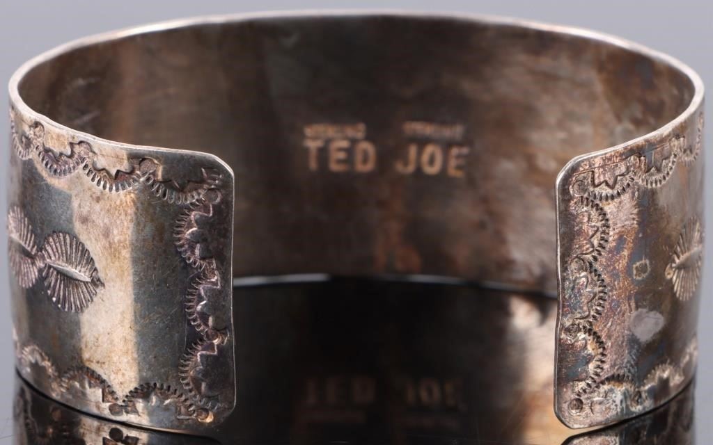 TED JOE NAVAJO Sterling Silver Turquoise Cuff Bracelet. Cuff is signed and marked.