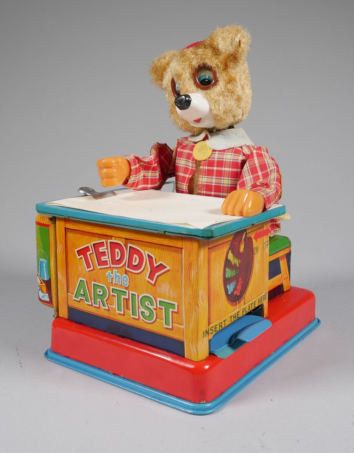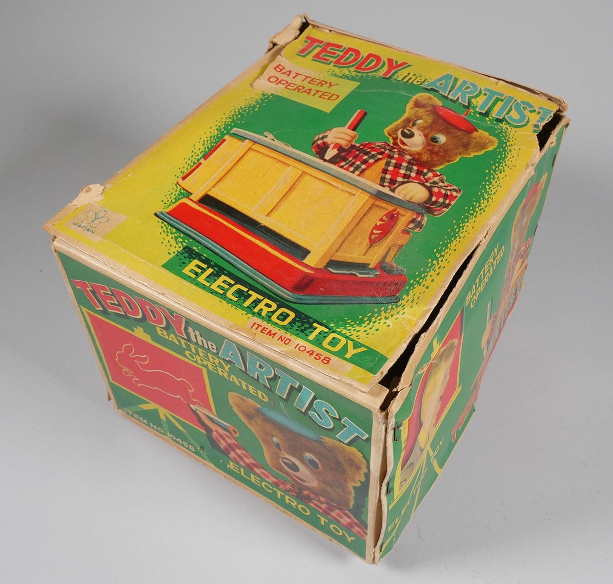Made in Japan by E.T. Co. Teddy the Artist animated bear toy #10458 battery operated toy. Teddy has minimal litho paint loss & light wear. There are some small holes in shirt sleeves. Battery compartment is clean and free of corrosion. Box has loss & multiple tears. Sketchbook, crayon and eight animal plates are included. Currently not running. Please see photos for more details on condition. The toys in today's auction are from a show dealer and have been in storage for over 15+ years. Some toys may require some level of cleaning and/or repair for operation.