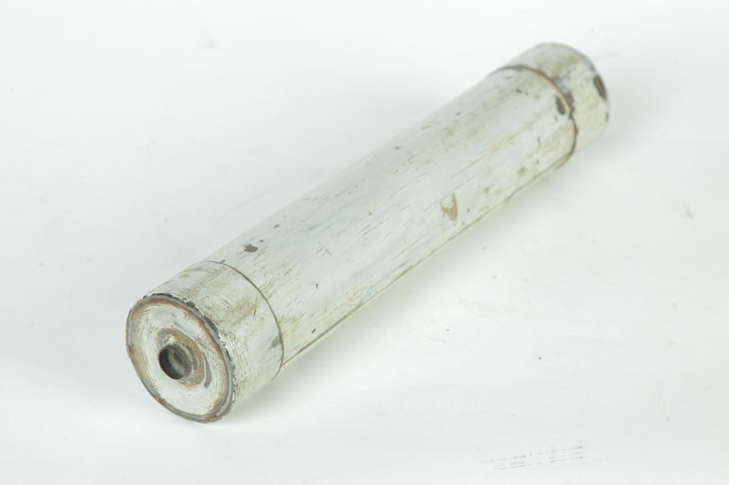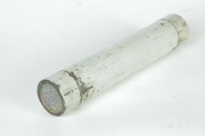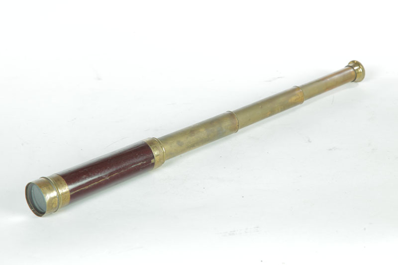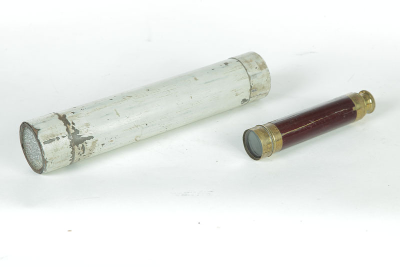American, late 19th-early 20th century. Four-part brass telescope with cloth covering (split), 23 1/4"l. extended, and a tin kaleidoscope, probably homemade. Painted white. Cracked eyepiece, 14 3/4"l.