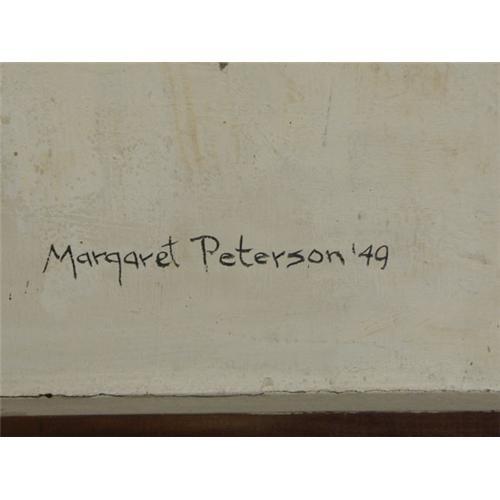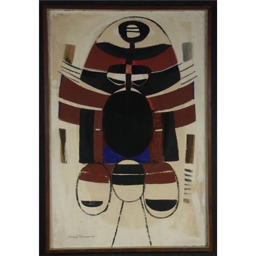 TEMPERA ON PANEL 48'' x 32'', Margaret Peterson (1902-1997), CA. Abstracted Human Figure. Signed and dated '49 lower left. Partial paper label from the San Francisco Museum of Art on the verso. Nail holes apparent on all corners and along right side. Some surface dirt as seen. Placed in a wood frame, as seen. A professor at UC Berkeley for over 22 years (where in 1950 she resigned during the infamous ''oath controversy''), Peterson was a Northwest native whose abstract style was influenced both by Northwest Indian art as well as the cubist style of Picasso. More info. in the white binder.