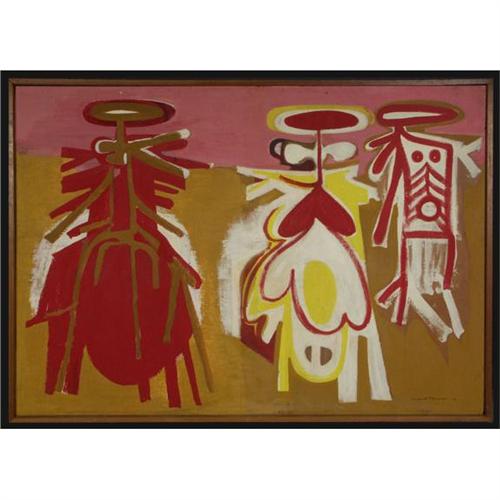 TEMPERA ON PANEL 48'' x 66 1/2'', Margaret Peterson (1902-1997), CA. ''Tree Figures of Sienna''. Signed and dated '48' lower right. Titled on the verso. Paper label from the Art Gallery of Greater Victoria on the verso. Crazing/chipping center and upper/lower center. Placed in a fitted wood frame. A professor at UC Berkeley for over 22 years (where in 1950 she resigned during the infamous ''oath controversy''), Peterson was a Northwest native whose abstract style was influenced both by Northwest Indian art as well as the cubist style of Picasso. More info. in the white binder.