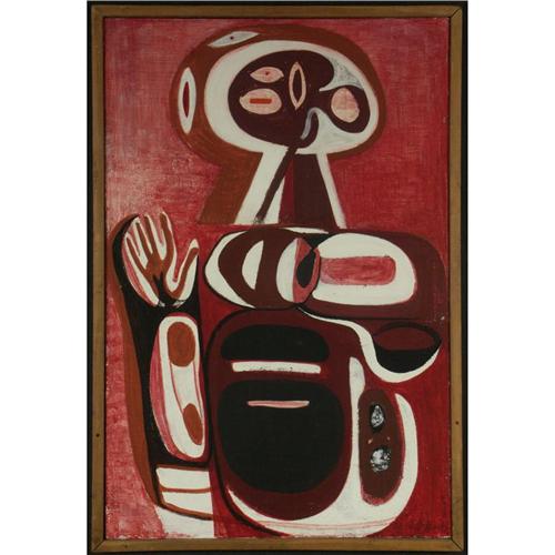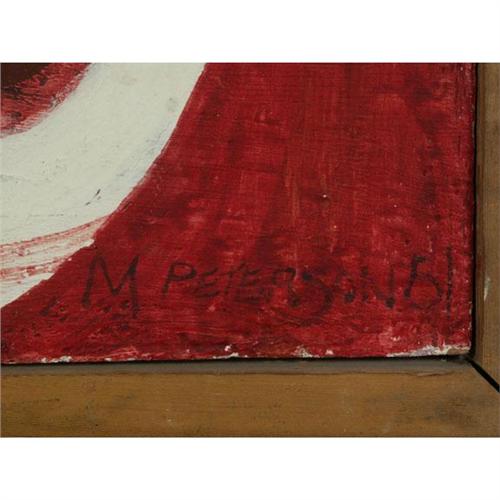TEMPERA ON PANEL 48'' x 32'', Margaret Peterson (1902-1997), CA. ''Figure on Alizarin''. Signed lower right. Paper label from the Art Gallery of Greater Victoria on the verso. Entry label for ''The 27th Annual Exhibition of Art, San Francisco, Women Artists'' on the verso. Note condition to include some chipping and nail holes along edges. Placed in a wood frame, as seen. More info. in the white binder.