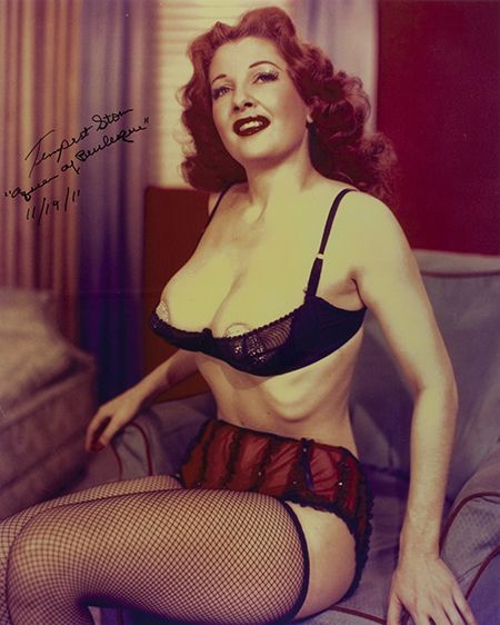 (b. 1928) American stripper and burlesque star, a contemporary of other noted performers such as Blaze Starr. Sultry oversize S.P. 16" x 19" color, a reproduction of a sexy portrait in her prime wearing a black balconette bra and fishnets. Signed in black marker with a bit of a shaky hand at top left: "Tempest Storm 'Queen of Burlesque' 11/19/11". Fine condition. VA-va-va-voom!