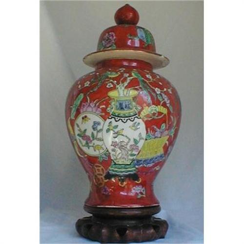 Chinese Red TEMPLE JAR with famille rose palette figurals. This is a handsome and unusual jar with Bhuddist symbols. Striking color, a great accent piece. Signed on base with seal mark.
