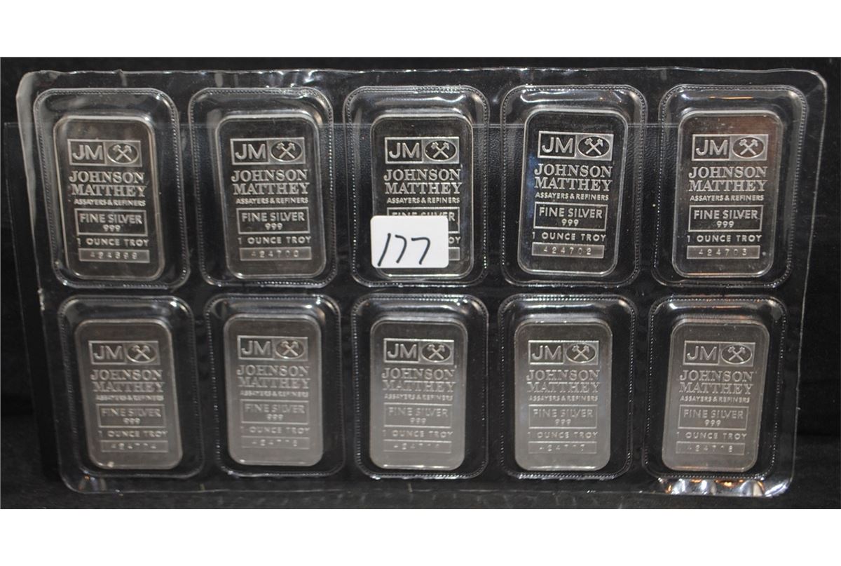 TEN 1 OUNCE "JOHNSON-MATTHEY' .999 FINE SILVER BARS FROM SAFE DEPOSIT - STILL IN THEIR ORIGINAL PLASTIC HOLDERS - SOLD PER BAR TIMES 10