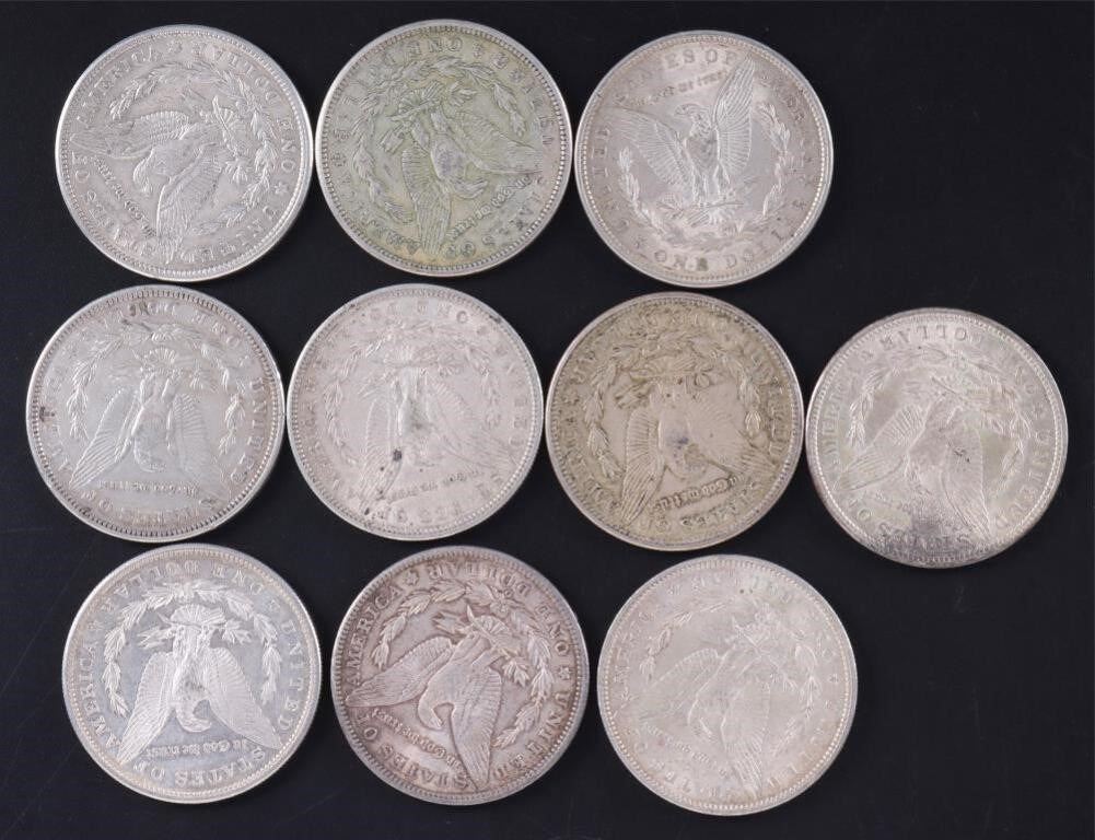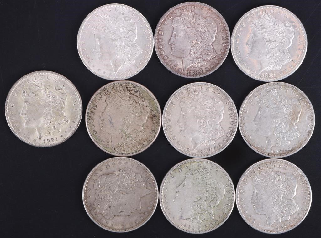Ten assorted 90% Morgan Silver Dollars. Condition for each coin ranges from G to MS.