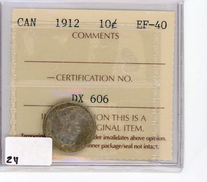 TEN CENT COIN (CANADA) *1912* (SILVER) *ICCS EF-40*