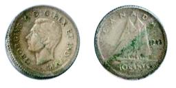 TEN CENTS. 1943. A ‘Clamshell’ split planchet, with an overall 50% split. VF. A rare George V major error. Ex. Feb. 2008 Torex. Lot #439.