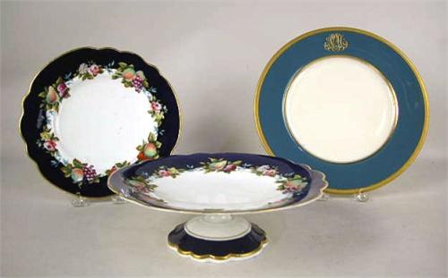 TEN LENOX BLUE AND GILT-DECORATED DINNER PLATES; monogrammed, 10 1/2"dia., TOGETHER WITH Five blue and fruit decorated plates and a compote, losses