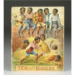 TEN LITTLE N*** BOOK BY McLOUGHLIN BROS. A late 19th Century book in vibrant colors depicting blacks in a comical way. SIZE: 12” x 10”. CONDITION: Overall condition very good, some wear, binding infirmity, & crayoning to back cover. JL 1-3446 (100-150)