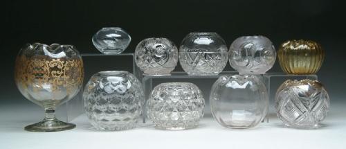 TEN ROSE BOWLS. Lot consists of six clear pressed glass rose bowls, three handblown clear rose bowls and an amber threaded and ribbed rose bowl. Three of the rose bowls are pictured in the "Collectible Glass Rose Bowls" by Johanna Billings fig. 303 pg. 95, fig. 325 pg. 100 and fig. 409 pg. 126. SIZE: Range from 3-1/4 in. to 5-1/4 in. dia. CONDITION: Very good to excellent. Collection of Johanna and Sean Billings 5-60868, 5-60887, 5-60904