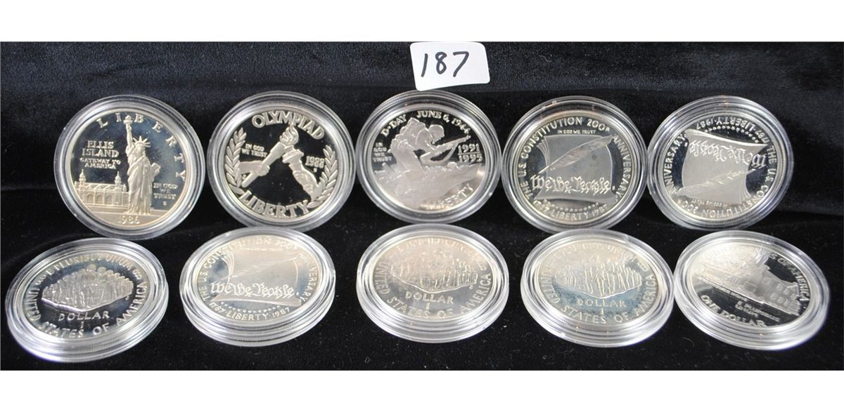 TEN SILVER (90%) COMMEMORATIVE DOLLARS INCLUDES - 1986 STATUE OF LIBERTY, 1987 WE THE PEOPLE, KOREA, 1988 OLYMPIAD, EISENHOWER ETC - STILL IN ORIGINAL PLASTIC - SOLD PER COIN TIMES 10