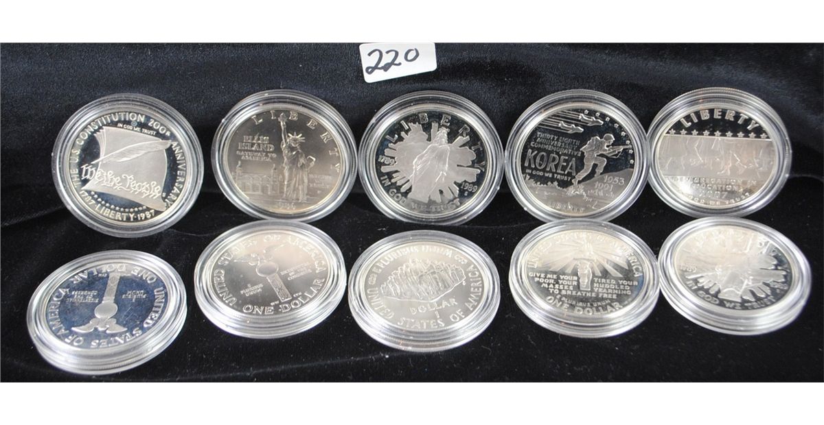 TEN SILVER (90%) COMMEMORATIVE DOLLARS INCLUDES "LIBERTY", WE THE PEOPLE, STATUE OF LIBERTY, KOREA, DESEGREGATION OF EDUCATION ETC - STILL IN ORIGINAL PLACTIC COVERS - SOLD PER COIN TIMES 10