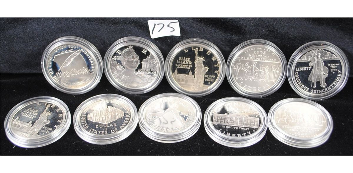 TEN SILVER (90%) COMMEMORATIVE DOLLARS INCLUDES - WE THE PEOPLE, COLUMBUS QUINCENTENNIAL, 1988 OLYMPIAD, DOLLY MADISON, 1986 STATUE OF LIBERTY & MORE - STILL IN ORIGINAL PLASTIC - SOLD PER SILVER COIN TIMES