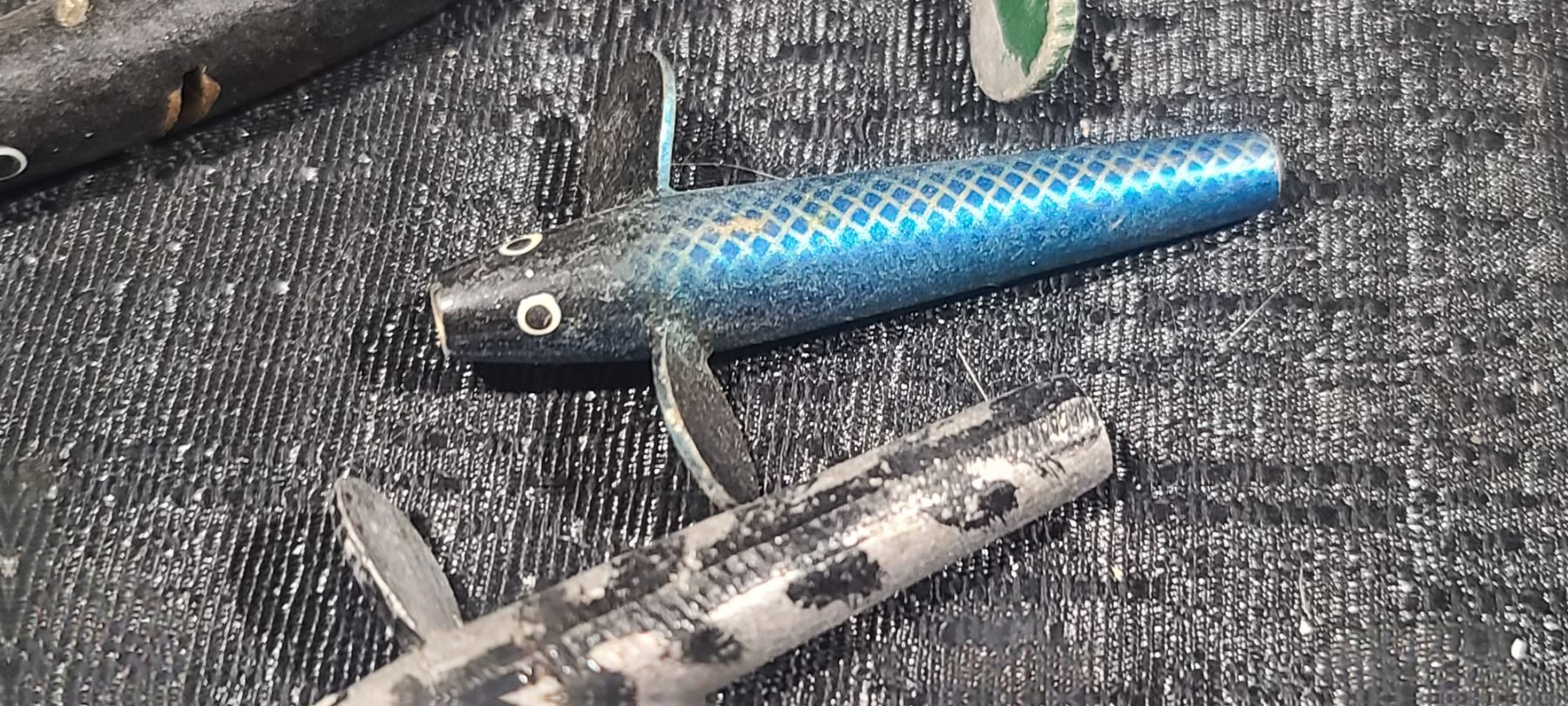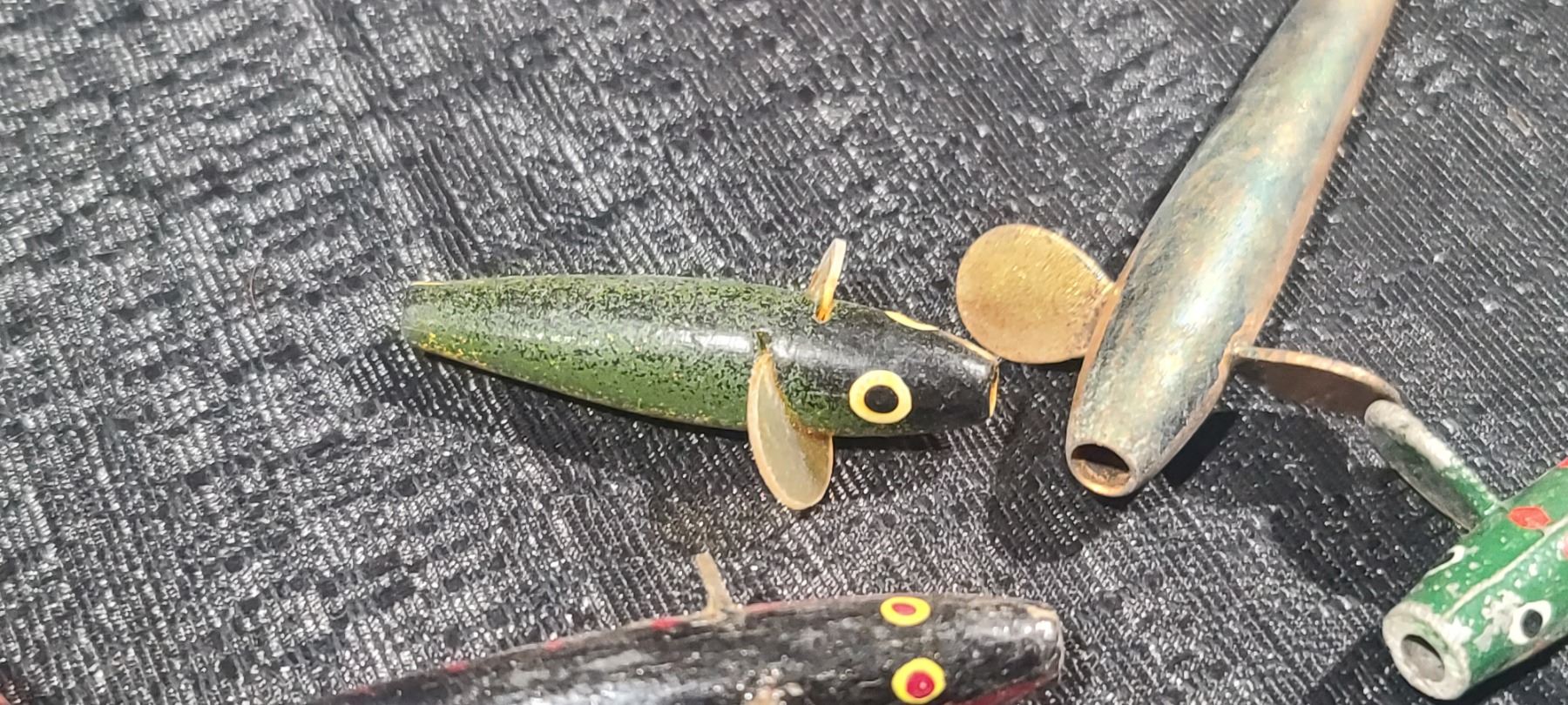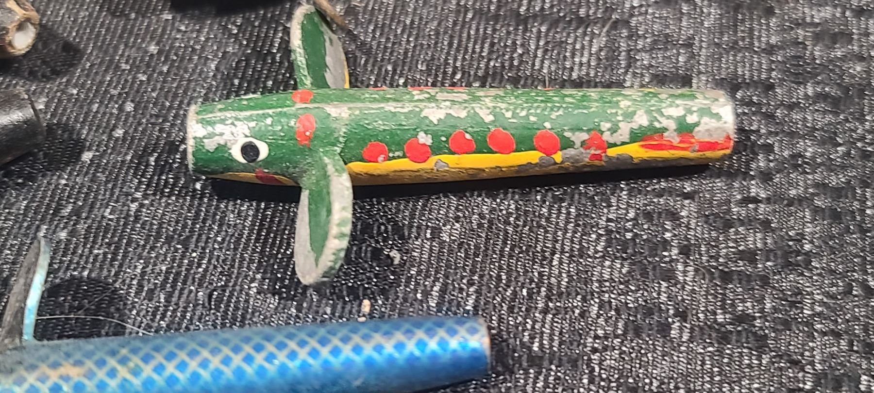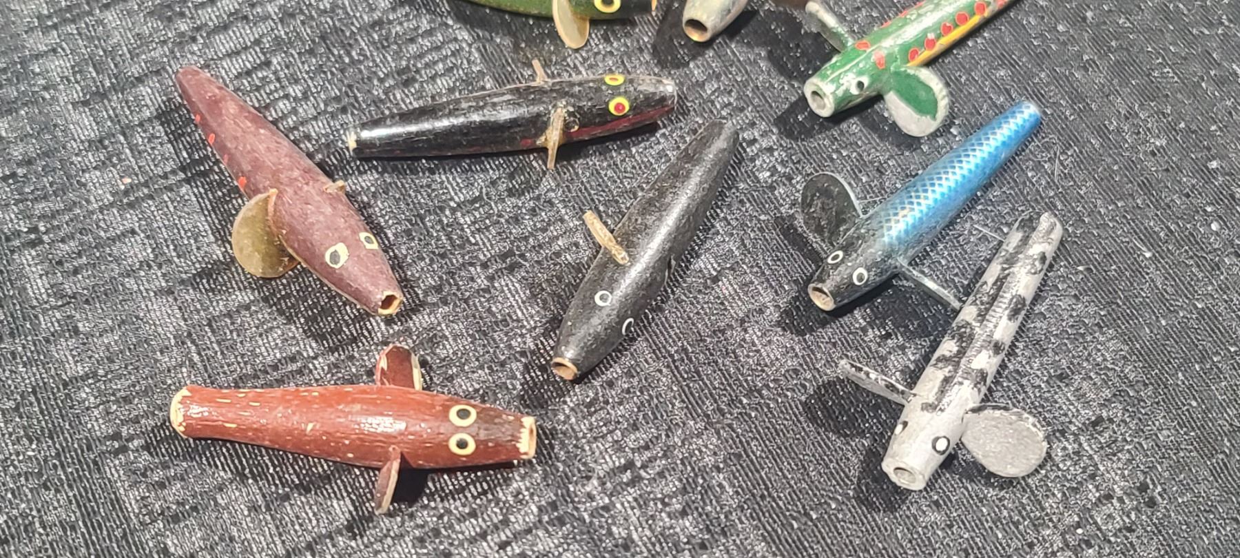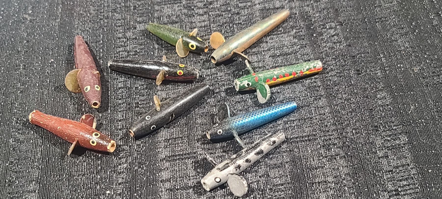 TEN VINTAGE 2 1/2" LURES AND HOOKS