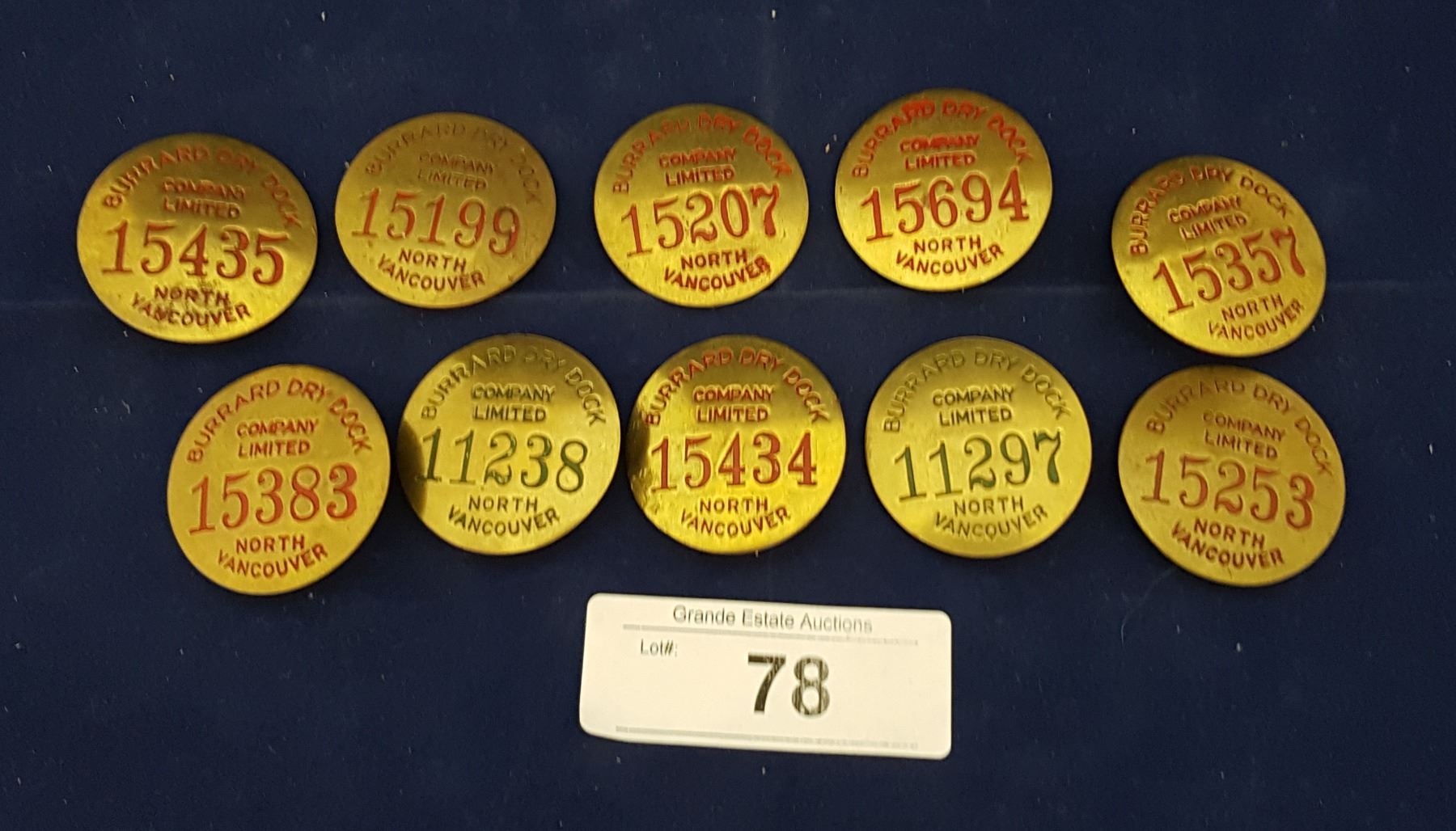 TEN VINTAGE VANCOUVER DRY DOCK WORKERS EMPLOYEE BADGES