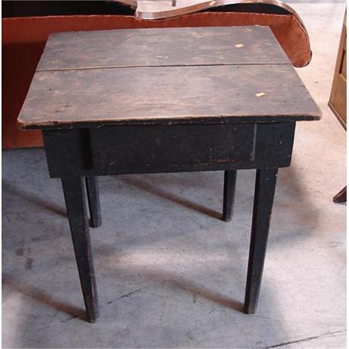 TENNESSEE SINGLE DRAWER WORK TABLE. Original blue paint and two board top on tapered and chamfered legs. Single mortised and nailed drawer. 29” H, 27” W, 23.25” D