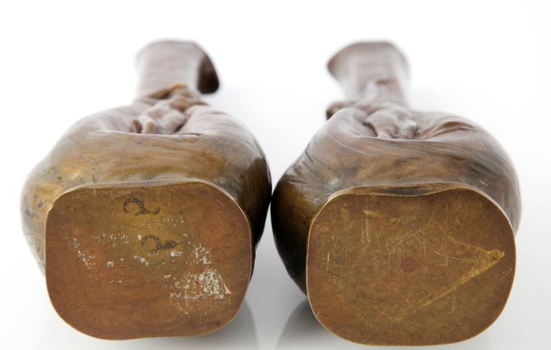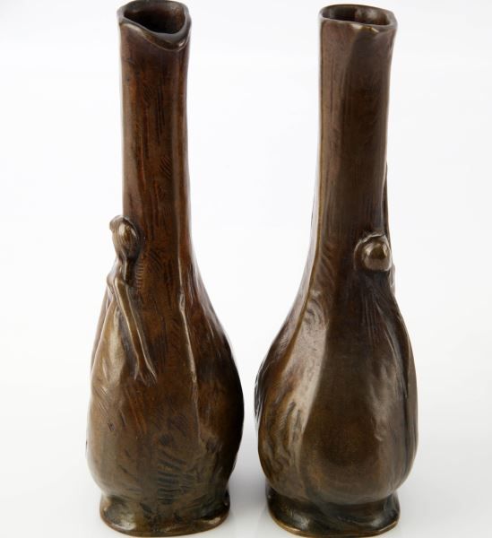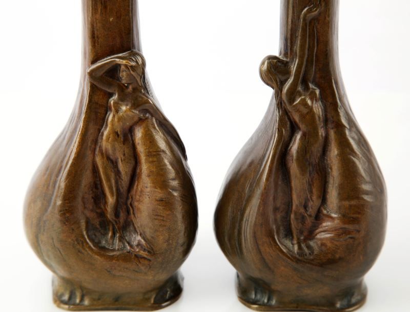 Peter Tereszczuk (Austrian, 1875-1963) bronze Art Nouveau-style bud vases with nearly nude women. Each measures approximately 17 cm in height. Overall in very good condition, no verdigris, probably cleaned. This lot has a reserve