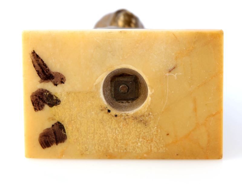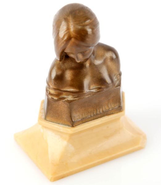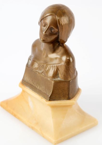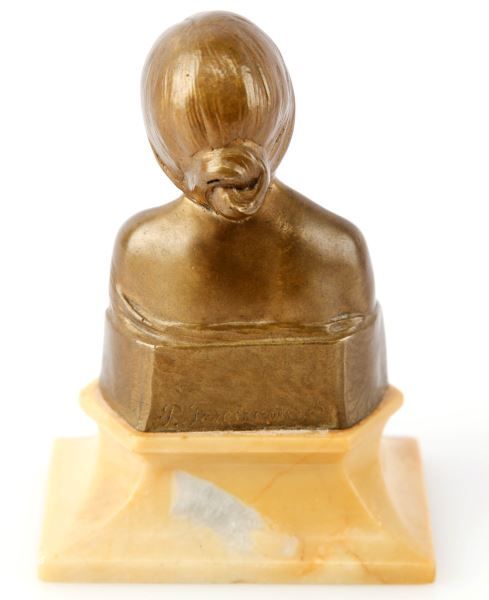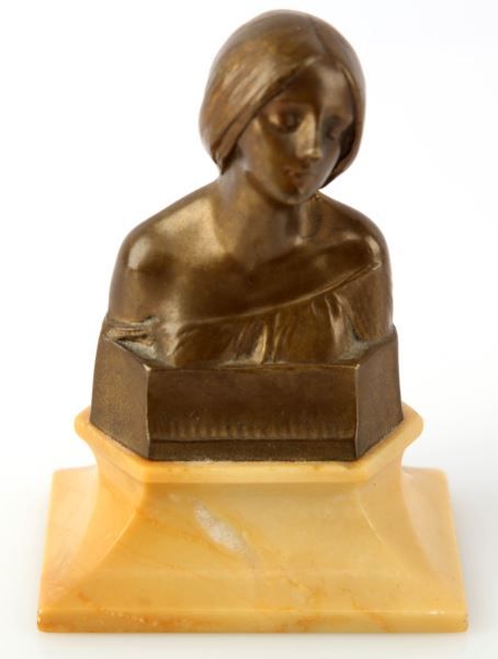 Peter Tereszczuk (Austrian, 1875-1963) pair of female busts on marble plinths. Each measures just over 3 inches in height on a 0.8 inch yellow-orange marble. Reverse signed P. Tereszczuk. In good condition, appears cleaned, no verdigris, one has a chipped corner. This lot has a reserve