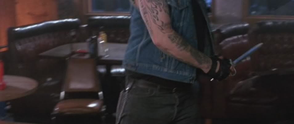 This is the Screen Used & Matched Hero knife from TERMINATOR 2, JUDGEMENT DAY! This is specifically seen in the beginning when Arnold enters the biker bar naked, and says I need your clothes, your boots, and your motorcycle. The biker then pulls this knife, and stabs Arnold in the chest. Arnold then pulls out the knife, and stabs the biker in the bike, pinning him to the pool table as he screams "Pull it out".