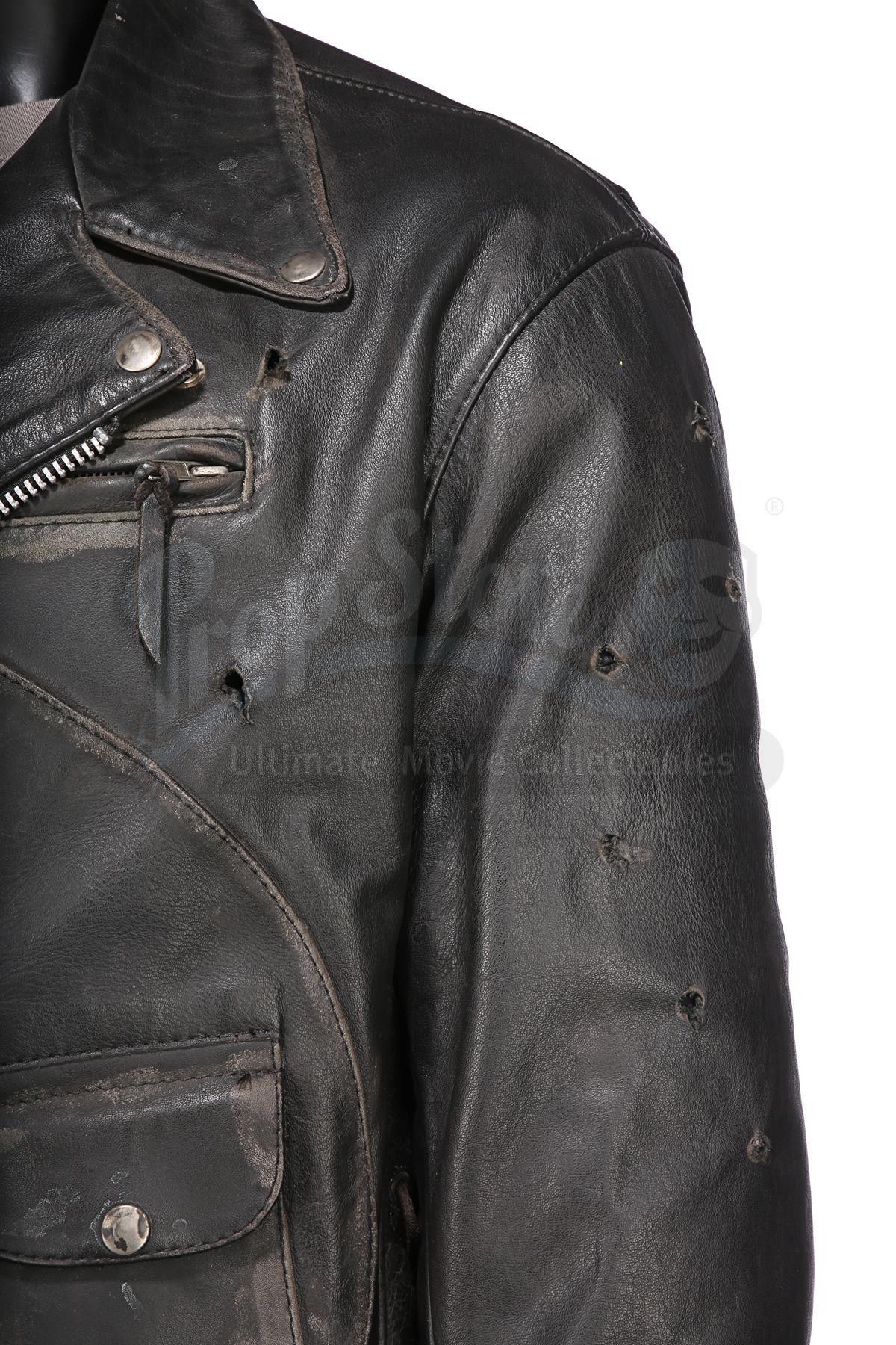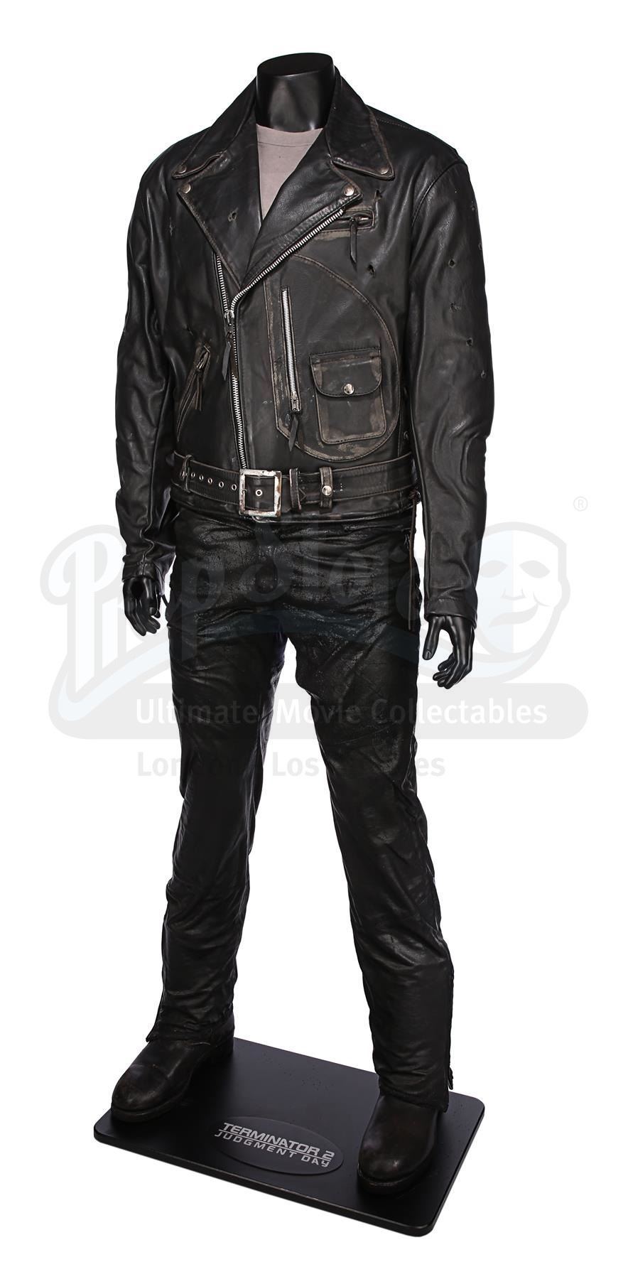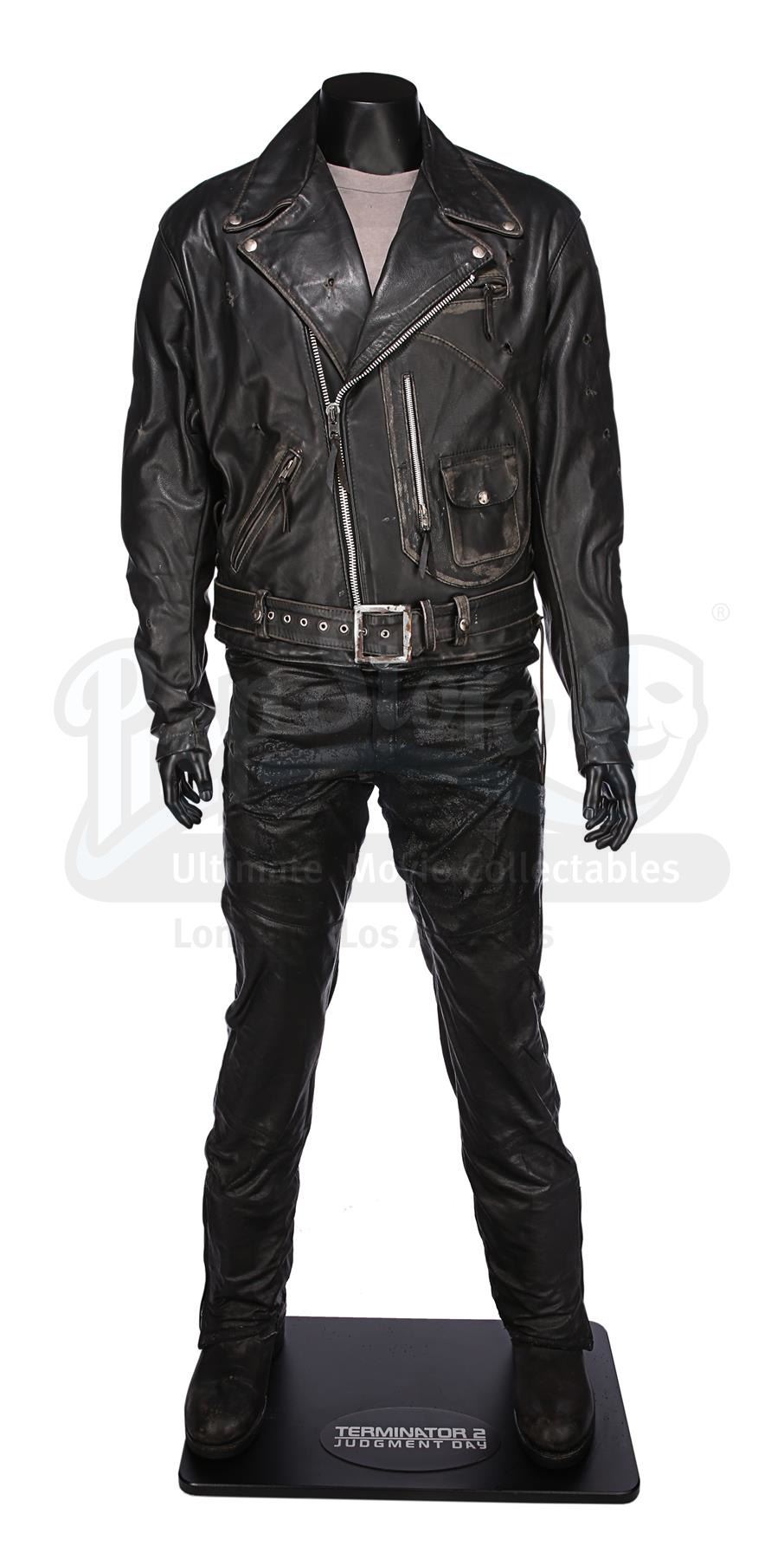 complete costume from James Cameron's sci-fi action sequel Terminator 2: Judgment Day. Terminator wore his costume throughout the film, from the opening scenes in which he stole the ensemble from a disgruntled biker, through the action-packed fight scenes against the seemingly invincible T-1000 (Robert Patrick), to the final scene when said goodbye to John (Edward Furlong) and Sarah Connor (Linda Hamilton), giving one final thumbs-up as he sank into molten steel.