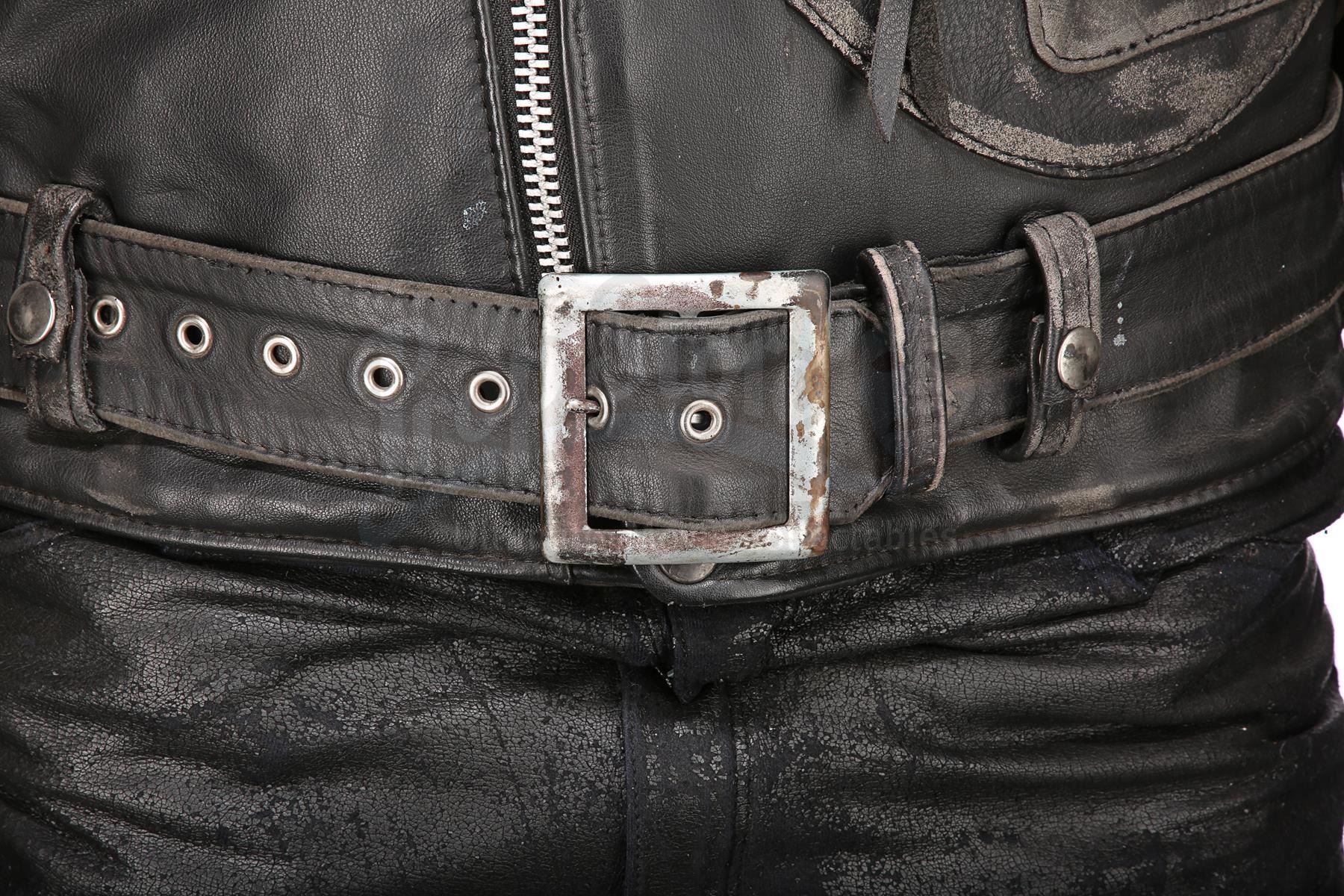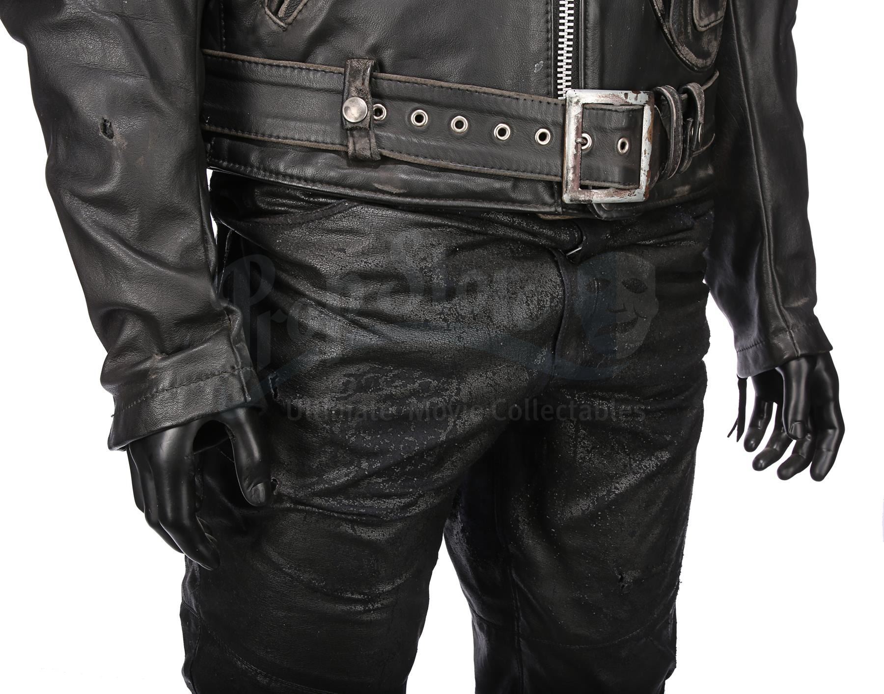 The costume comprises a black leather motorcycle jacket with a self-belt bottom (marked "S41" in white ink inside one of the pockets); a pair of black custom-made faux-leather trousers (Size 36); a leather belt with a metal buckle; a grey T-shirt; and a pair of black Harley Davidson motorcycle boots with buckles across the top of the feet.