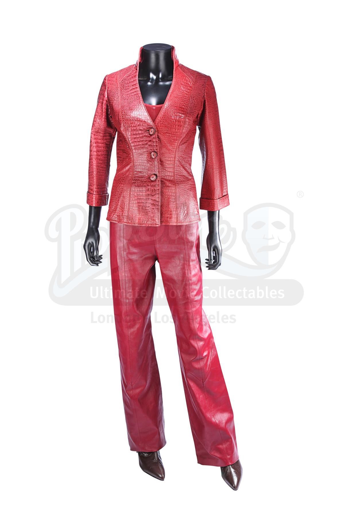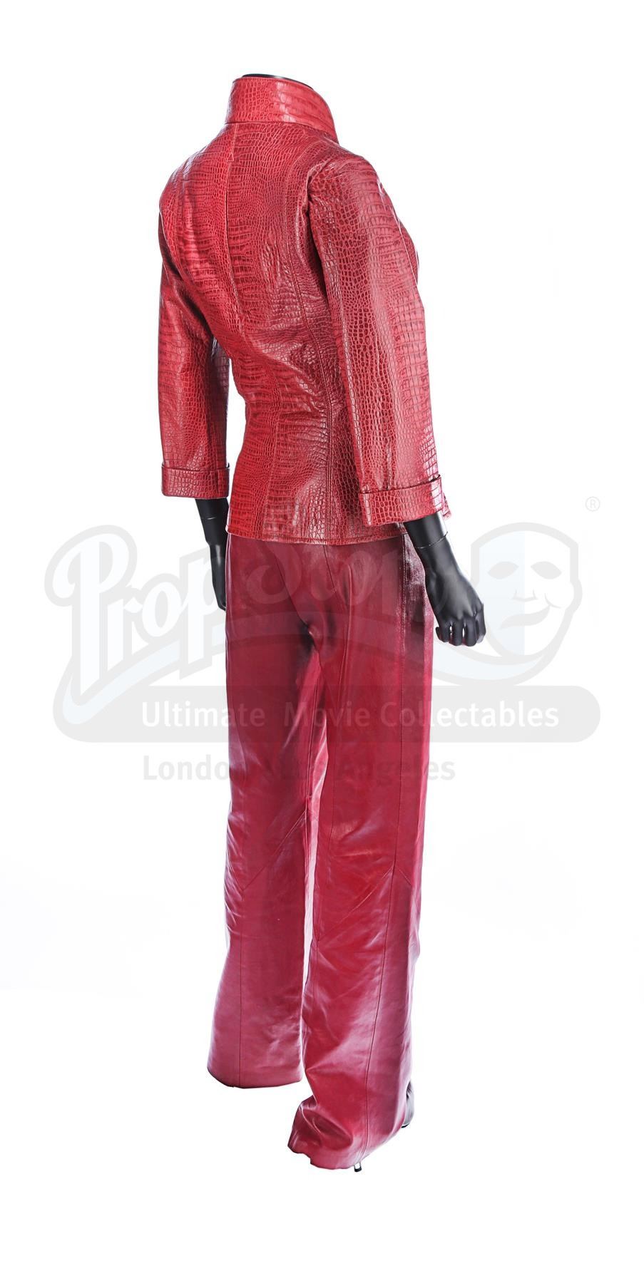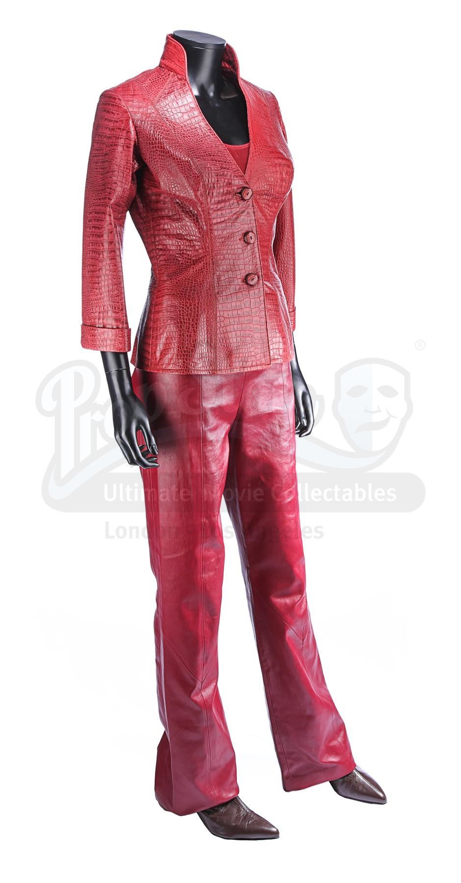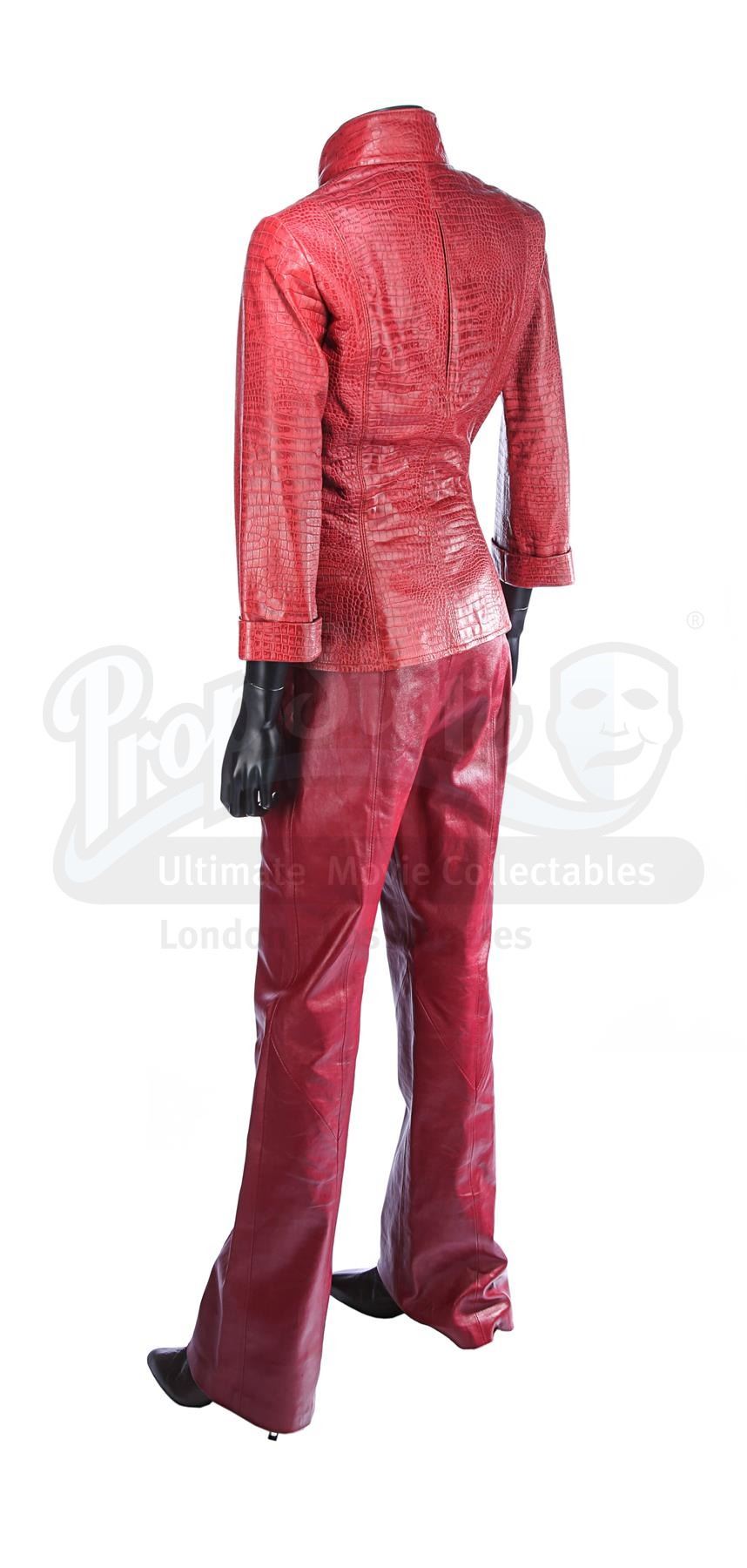Designed by April Ferry, the costume consists of a red faux-crocodile-skin jacket and a pair of burgundy faux-leather trousers dressed over a thin red nylon mesh leotard. Featuring a stand-up collar, the jacket fastens with brown and red plastic buttons and Velcro strips. The trousers fasten at the right hip with a side zip and a hook-and-eye clasp. Also included is a pair of short brown leather boots with silver-coloured stiletto heels. An intentional split adorns the back seam of the jacket and minor wear is present from production use.