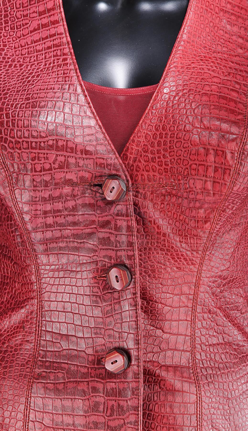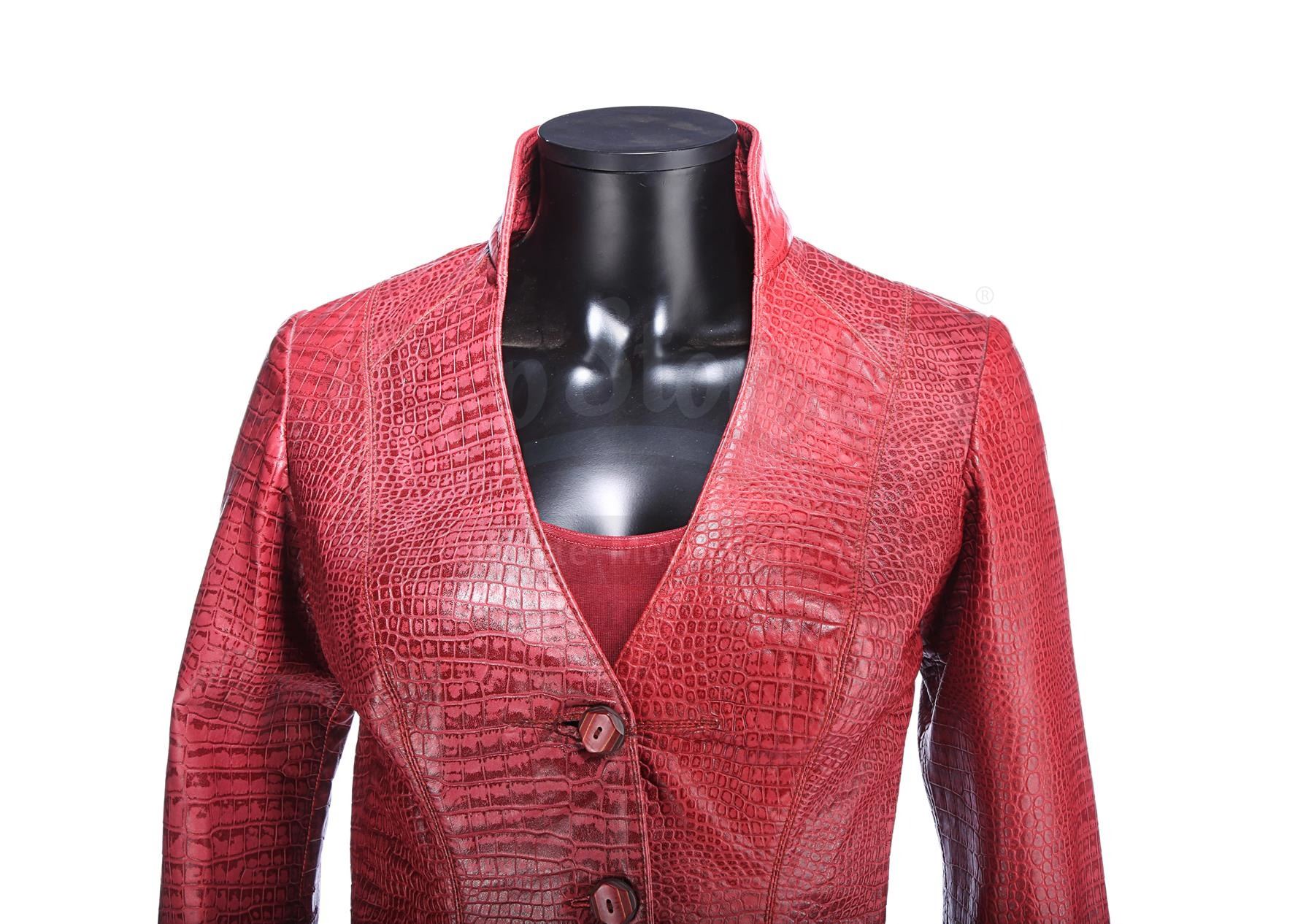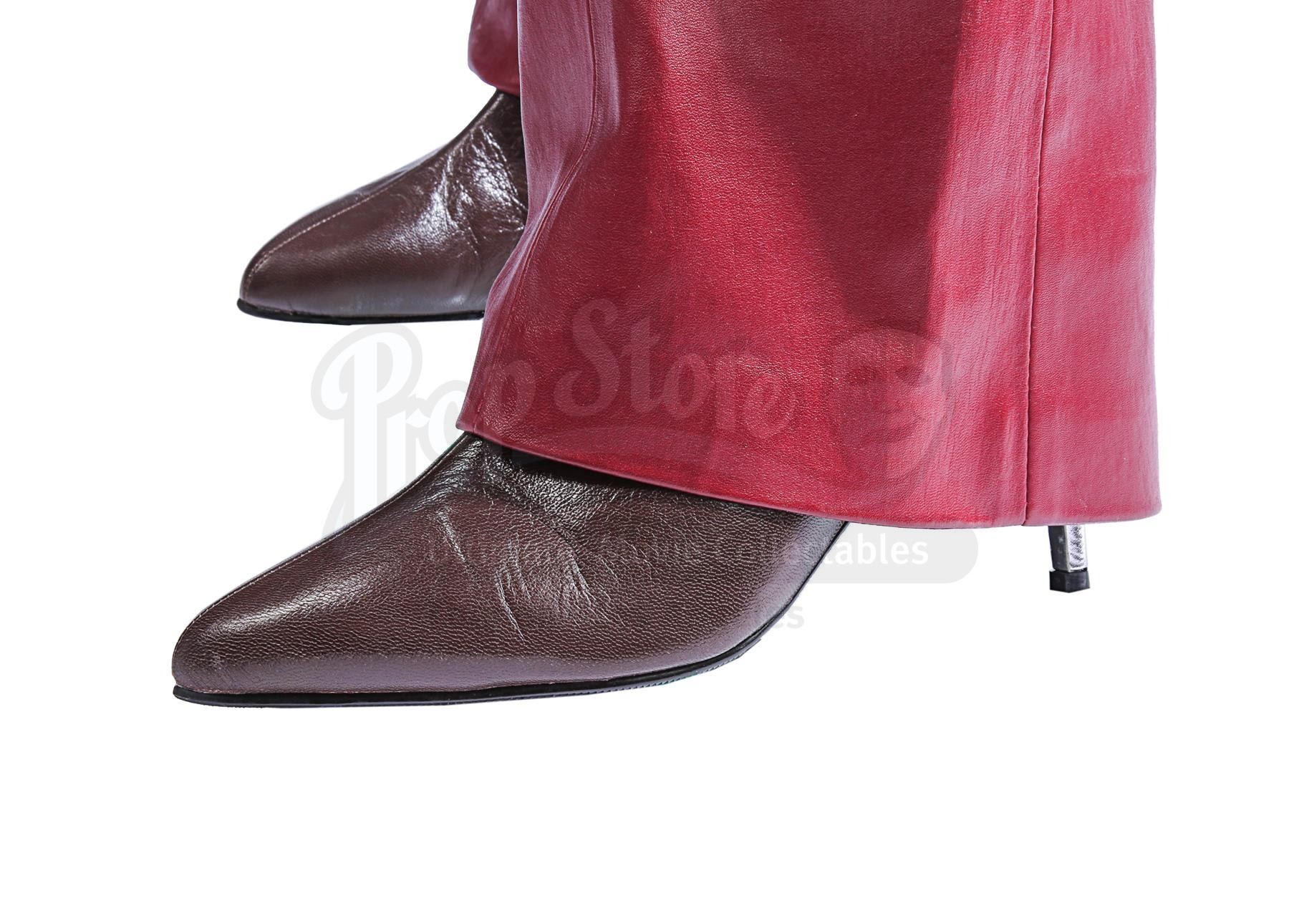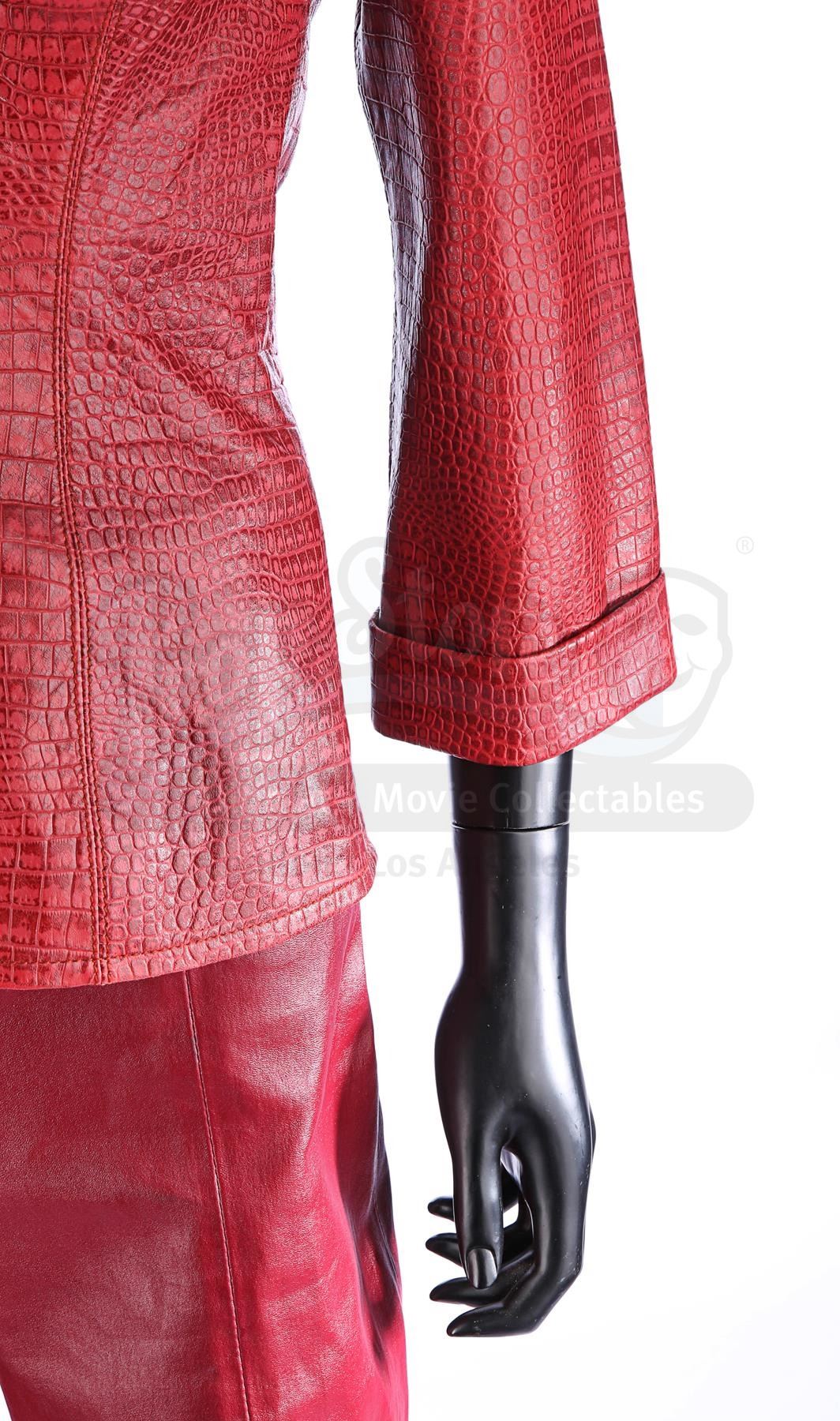 Designed by April Ferry, the costume consists of a red faux-crocodile-skin jacket and a pair of burgundy faux-leather trousers dressed over a thin red nylon mesh leotard. Featuring a stand-up collar, the jacket fastens with brown and red plastic buttons and Velcro strips. The trousers fasten at the right hip with a side zip and a hook-and-eye clasp. Also included is a pair of short brown leather boots with silver-coloured stiletto heels. An intentional split adorns the back seam of the jacket and minor wear is present from production use.