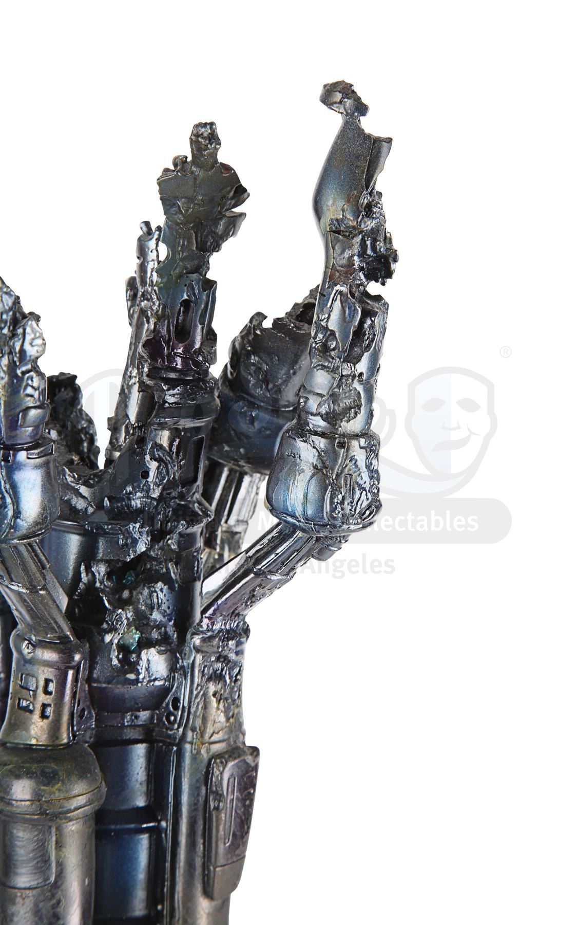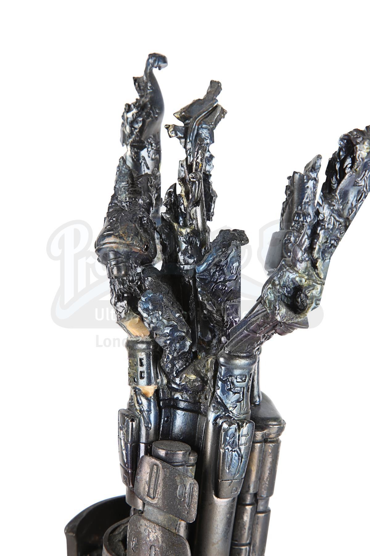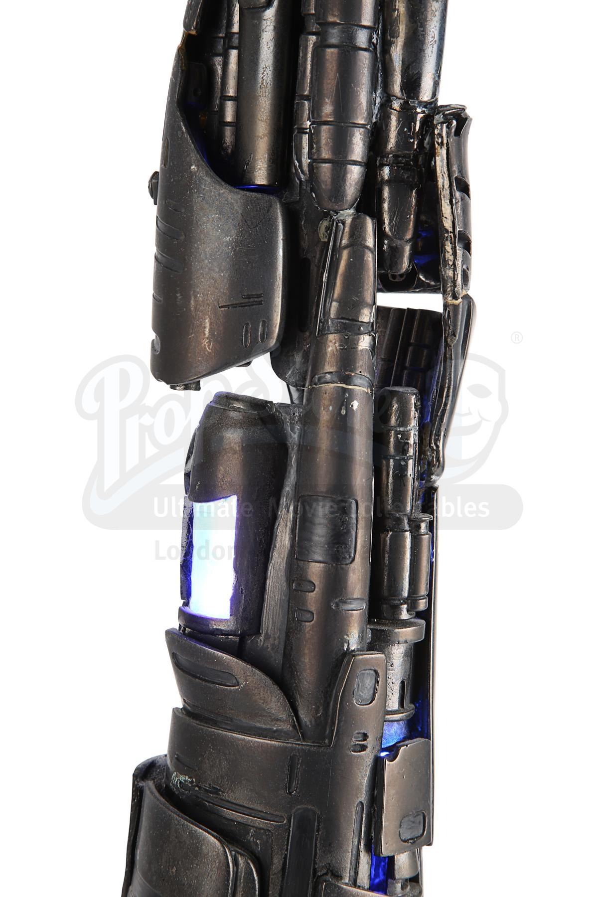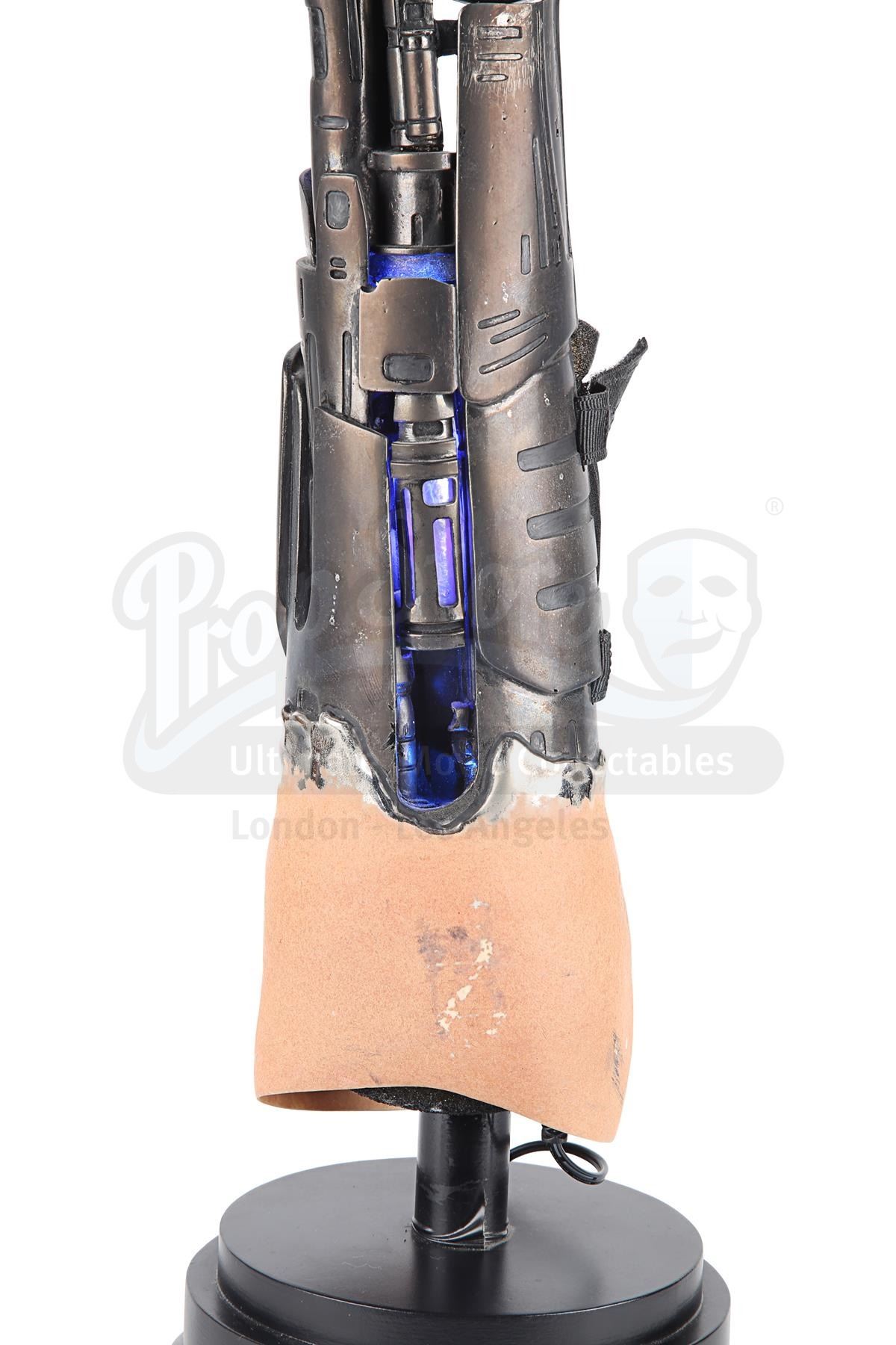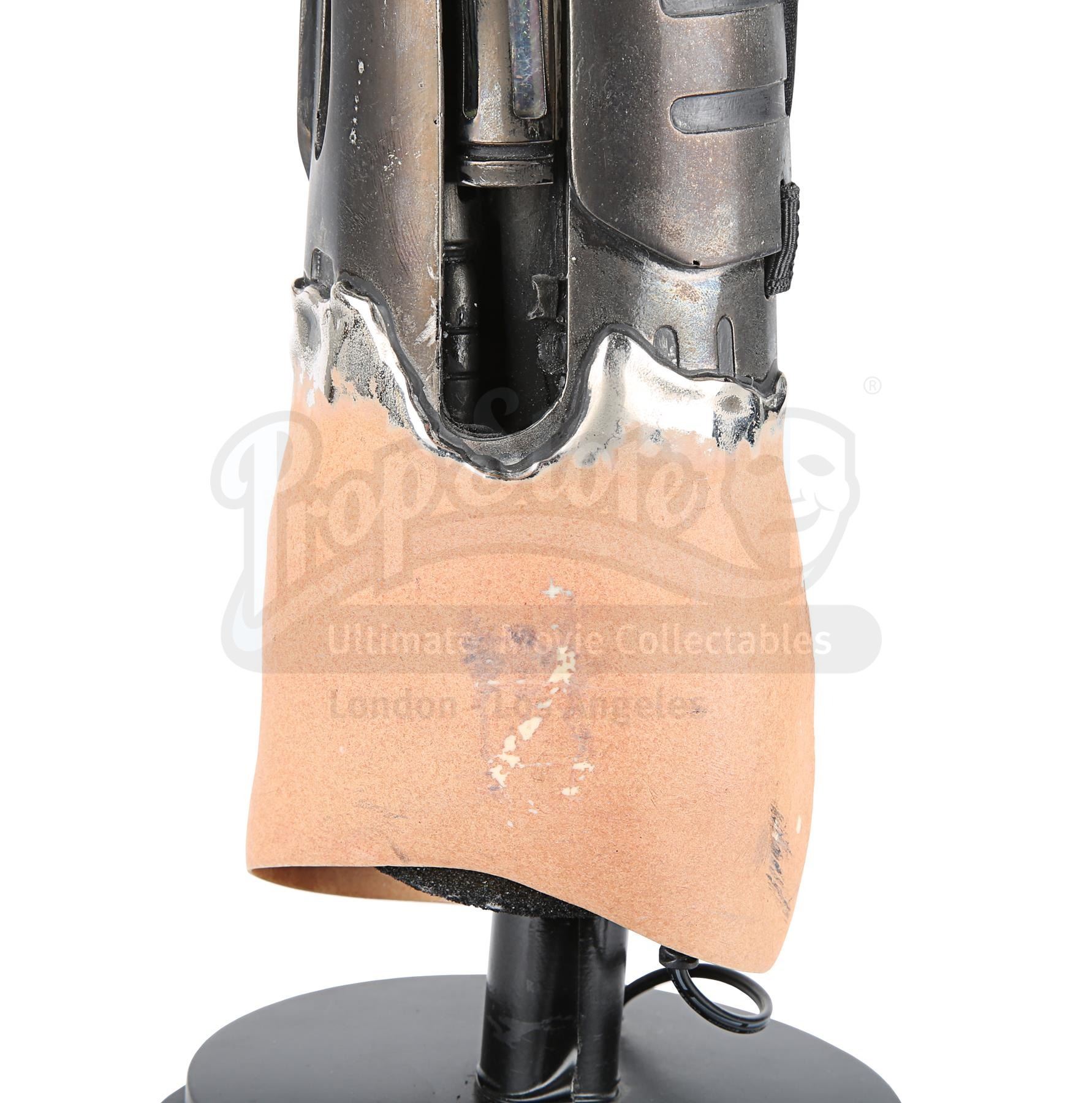 The majority of the arm is made of chrome-plated metal painted black, and displays four €˜battle' damaged prongs at the top. Made of plastic, the lower part of the arm is painted to replicate human skin, and two black Velcro straps adorn the back.