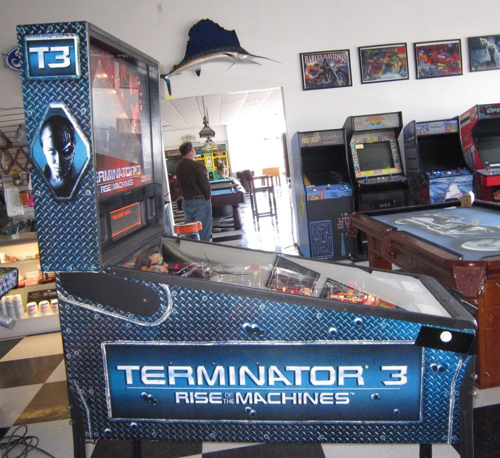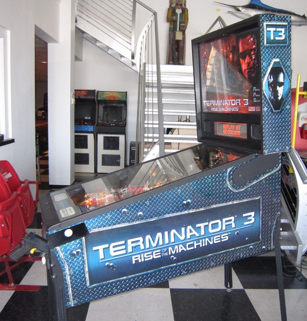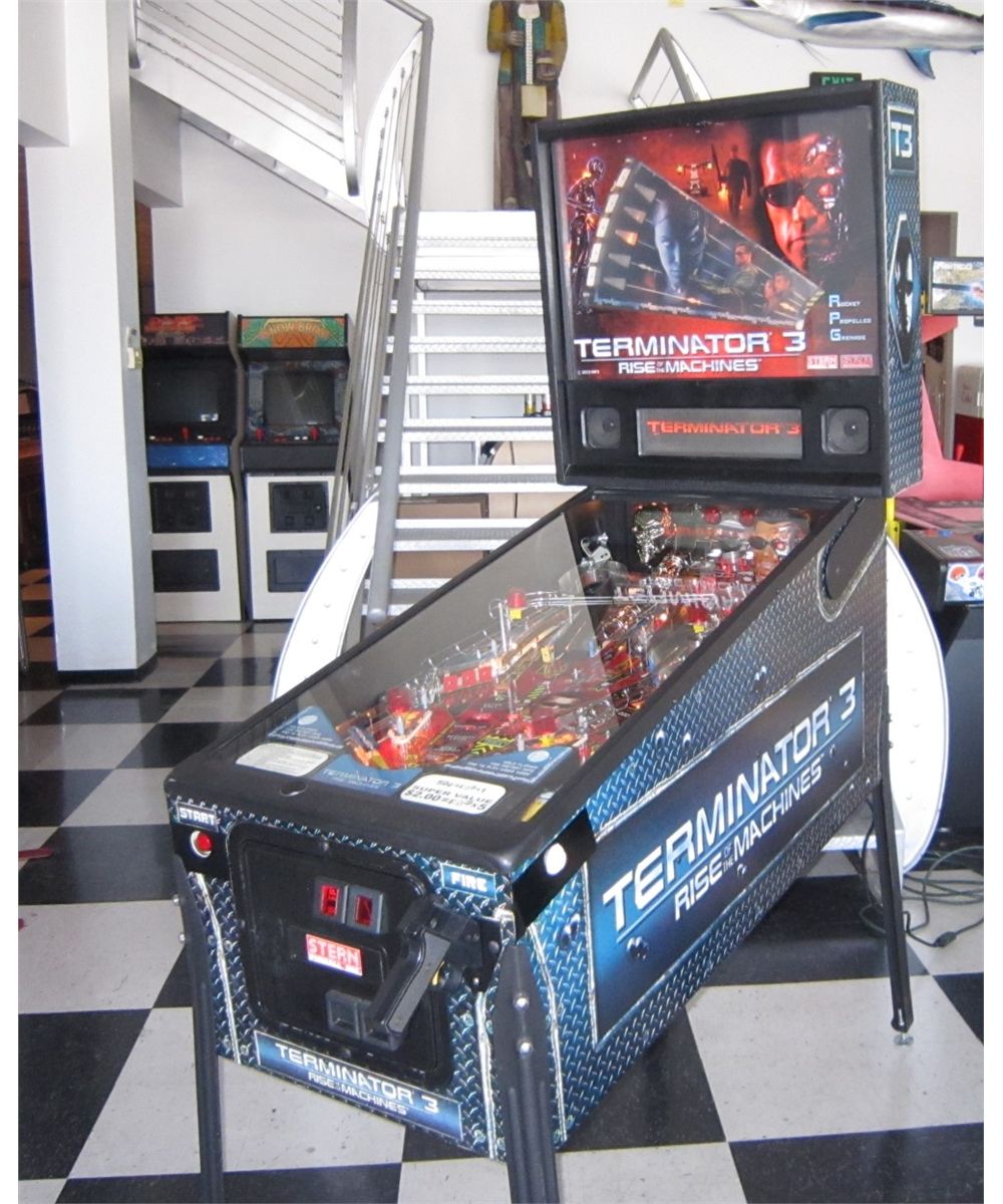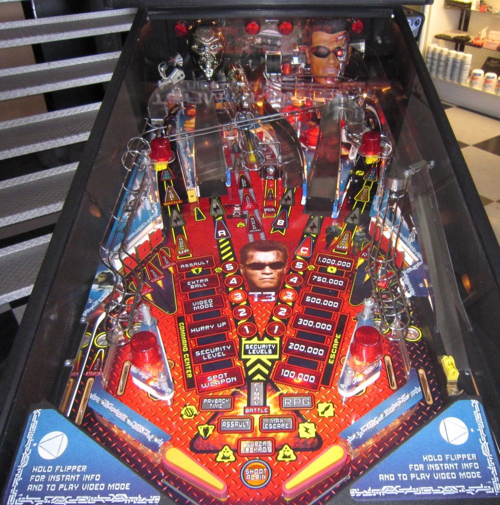 Designed by Steve Ritchie, T3 combines all the intensity of this non-stop action movie with pinball at its fastest and most daring. The TERMINATOR 3: RISE OF THE MACHINES pinball offers non-stop action features, including a Rocket Propelled Grenade launcher in the backglass. This interactive mechanism fires balls into targets for high score and progressive game play. Great sound and music. This game was traded to us by a local collector.