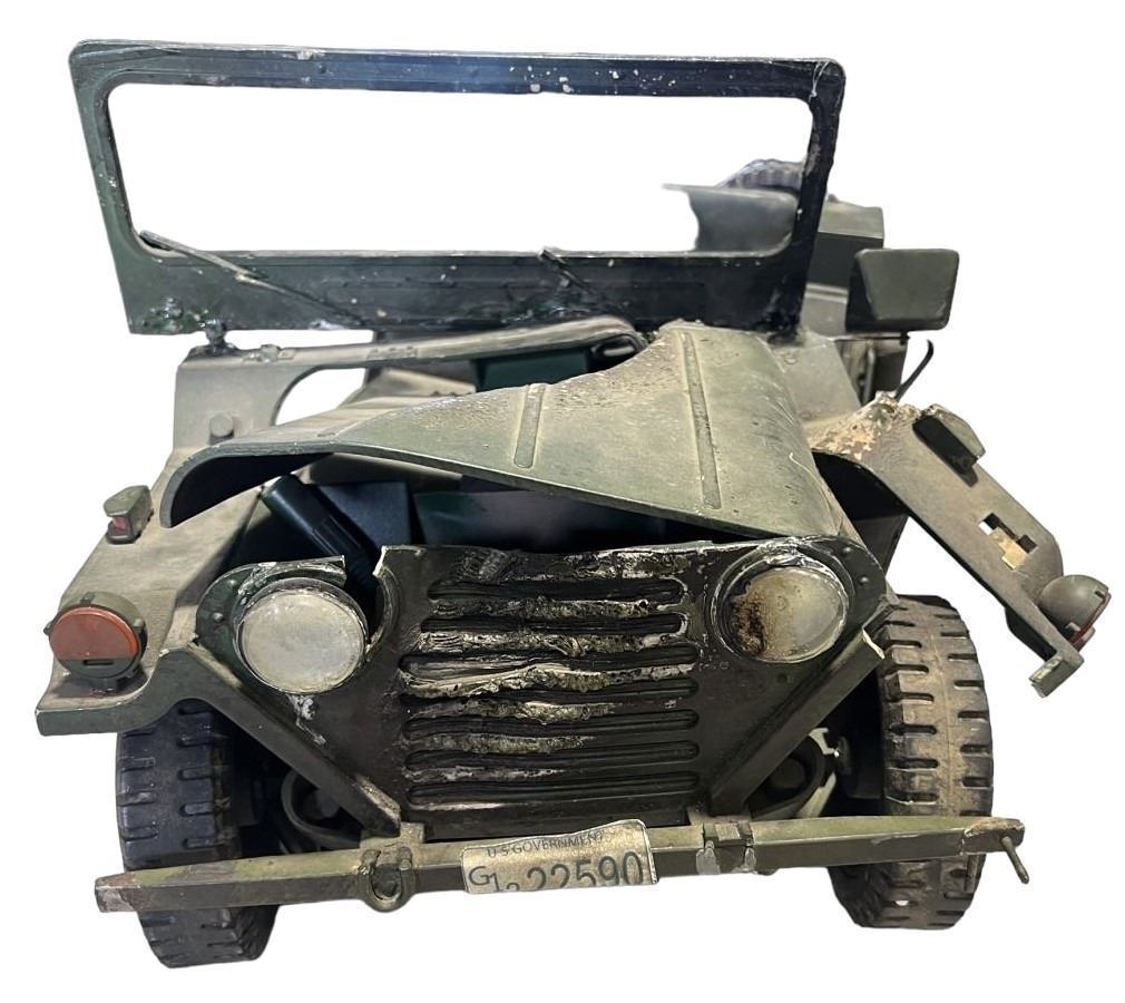 This was all but eviscerated during film use. I painstakingly sifted through the rubble, gathered the pieces, and resurrected this jeep into what you see here. There are a few added pieces like the back pack, medic kit, etc that may not have been part of it originally, but every last piece is Screen Used.