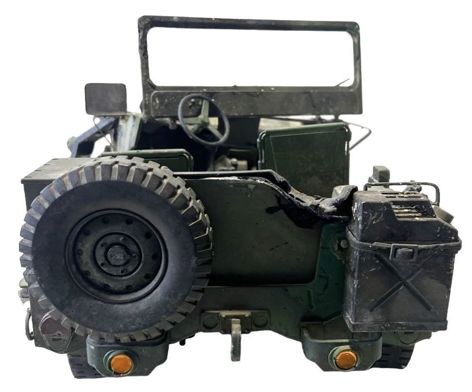 This is the highly detailed, and incredibly cool complete 1:6 scale miniature Screen Used and Matched Military Jeep that is seen and hit several times when the Sikorsky Sea King Arnold crashes in Terminator 3 Rise of the Machines.