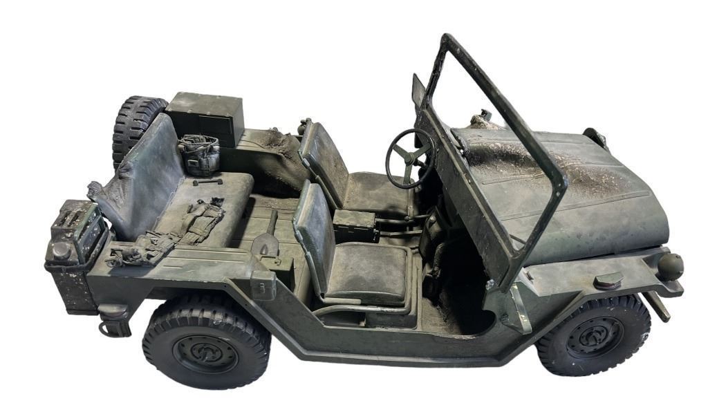 This is the highly detailed, and incredibly cool complete 1:6 scale miniature Screen Used and Matched Military Jeep that is seen and hit several times when the Sikorsky Sea King Arnold crashes in Terminator 3 Rise of the Machines.