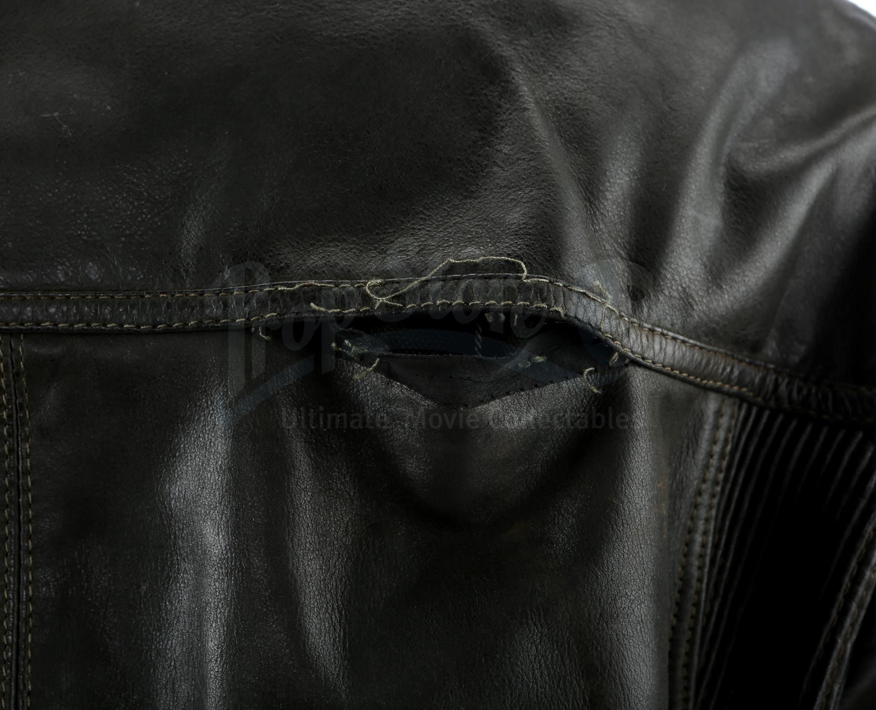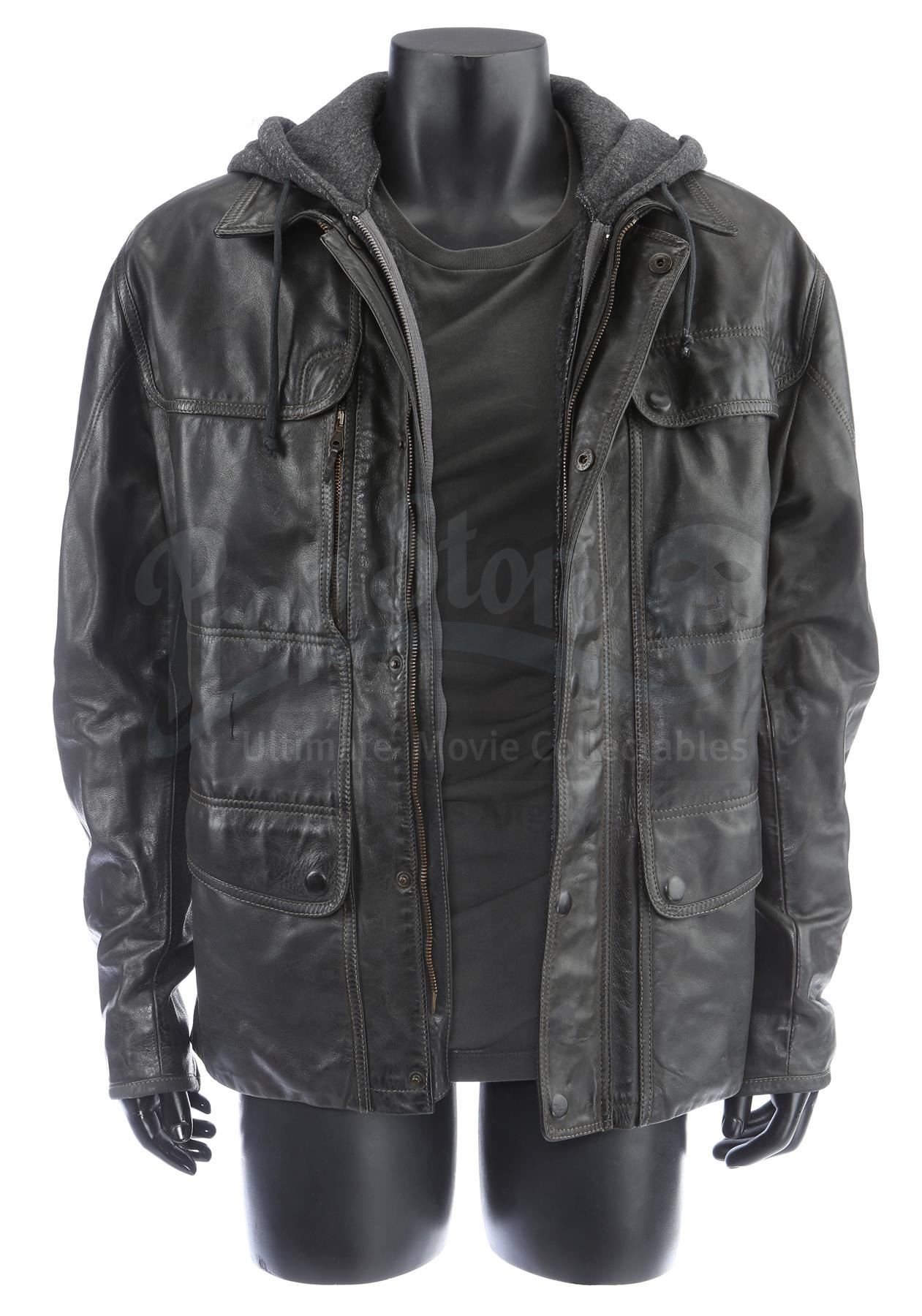 The costume includes a black-and-grey leather hooded button-up coat, which is labelled "Stunt" on the interior; a dark grey cotton T-shirt; and a pair of wardrobe tags marked for stunt double Billy D. Lucas. The costume is intentionally distressed by production to look battle-damaged, with several holes and grime applied throughout.