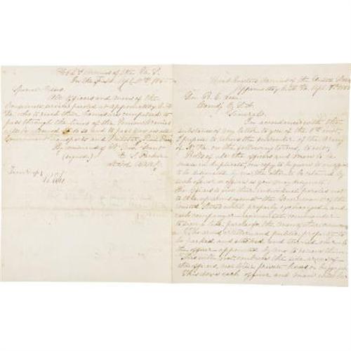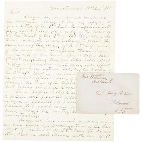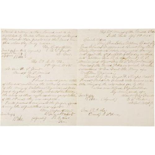 <B>'TERMS OF SURRENDER' LETTERS SIGNED BY CONFEDERATE GENERAL ROBERT E. LEE.</B></I> On April 9, 1865 Confederate General Robert E. Lee agreed to the Terms of Surrender as laid out by Union Lieutenant General Ulysses S. Grant, in effect ending the bloody conflict known as America's Civil War. The original letters between the two Generals is lost to history. But General Lee had the foresight to have these actual 'true copies' of the letters drafted which he has personally signed.<BR><BR>These four letters dated April 9th and 10th of 1865 begin with the original letter sent on April 9th from General Grant to General Lee dictating the Terms of Surrender for the Army of Northern Virginia. General Lee signs "<I>True Copy from the original in my possession, R. E. Lee</B></I>" at the bottom left of the letter dated April 9, 1865. In the next letter on the same date when Lee agrees to the Terms of Surrender, he signs "<I>True Copy, R. E. Lee</B></I>". In the third and fourth letters Lee again signs the documents that dictate the manner in which the Confederate forces are to surrender and be given safe passage home. They are well documented historically as they were once the property of General Henry Wise and have descended from his estate to a private collector. Published in <I>The Appomattox Paroles, April 9, 1865</B></I> by Nine and Wilson (pages 2, 5), they were also noted in <I>To Appomattox - Nine April Days, 1865</B></I> by Davis (page 383).<BR><BR>General Wise cherished the letters until his death. A lawyer before the war, he was elected to Congress and later served as the minister to Brazil. He was elected governor of Virginia in 1856 and was past middle age at the start of the Civil War. Although not a military man by training, he volunteered his services and was made a brigadier general on June 5, 1861. From West Virginia to Florida he fought bravely throughout the war. Heartbroken at the fall of the Confederacy he never sought amnesty and died in Richmond on September 12, 1876 leaving these letters to his family, after which they descended to a private collector and this sale.<BR><BR>But it was Robert E. Lee and Ulysses S. Grant that made history the day these communications were sent and signed by Lee. These sorts of communications were traditionally brief and written without thought to penmanship, the art of war being the job at hand. These true copies were somewhat more formal and intended to be kept for posterity, something General Wise realized at the time. He would be the person General Lee designated to keep them for historical purposes.<BR><BR>These letters sparked a series of meetings between officers of both sides, a commission that would decide the actual terms of the surrender. Generals Lee and Grant would meet only once more concerning the Surrender, Grant preferring to travel to Washington, DC and forego witnessing the actual surrender ceremonies. Lee signed his historical farewell address to his troops, his 'General Order Number 9', one of the most famous documents in military history. But these 'Terms of Surrender' documents signed by General Lee started the process. The letters are as follows:<BR><B><BR>Letter signed by Robert E. Lee, written from Lieutenant General Ulysses S. Grant to Lee:</B></I><BR><I>Appomattox Court House</B></I>.<BR><I>Head Quarters Armies of the United States<BR>Appomattox C. H. Va. Apl. 9th 1865<BR>Gen R. E. Lee<BR>Comd'g C.S.A.<BR>General,<BR>In accordance with the substance of my letter to you of the 8th inst., I propose to receive the surrender of the Army of Northern Virginia on the following terms to wit:<BR>Roles of all the officers and men to be made in duplicate, one copy to be given to an officer to be designated by me, the other to be retained by such officer or officers as you may designate. The officers to give their individual paroles not to take up arms against the Government of the United States until properly exchanged and each company of regimental commander to sign a like parole for the men of their commands.<BR>The arms, artillery, and public property to be parked and stacked and turned over to the officer appointed by me to receive them. This will not embrace the side arms of the officers, nor their private horses, or baggage. This done each officer and man will be allowed to return to their homes, not to be disturbed by United States authority as long as they observe their parole and the laws in force where they may reside.<BR>Very respectfully,<BR>U.S. Grant<BR>True copy in my possession (signed) R. E. Lee</B></I><BR><B><BR>Letter signed by Robert E. Lee to Ulysses S. Grant</B></I>: <I><BR>Hd. Q. A. N. Va.<BR>9th April 1865<BR><BR>Lt. Gen. U. S. Grant<BR>Commandg U. S. Armies<BR>General<BR>I have received your letter of this date containing the terms of surrender of the Army of Northern Virginia as proposed by you. As they are substantially the same as those expressed in your letter of the 8th inst., they are accepted.<BR>I will proceed to designate the proper officers to carry the stipulations into effect.<BR>Very respectfully<BR>Your ob serv<BR>R. E. Lee<BR>Gen<BR>True Copy<BR>(signed) R. E. Lee</B></I><BR><B><BR>Letter signed by Robert E. Lee, written to him from General Grant:</B></I><I><BR>Hd. Qre Armies of the United States<BR>In the Field April 9th 1865<BR>Special Orders,<BR>Maj. Gen. John Gibbon, Brevet Maj. Gen. Charles Griffen and Brevet Maj. Gen. Wesley Merritt are hereby designated to carry into effect the Stipulations this day entered into between Gen. R. E. Lee Comd'g C.S. Armies and Lieut. Gen. U. S. Grant comd'g Armies of the United States, in which Gen. Lee surrendered to Gen. Grant the Army of Northern Virginia.<BR>Brevet Brig. Gen George H. Sharpe Asst. Provost Marshall General will receive and take charge of the rolls called for by the above mentioned Stipulations.<BR>By command of<BR>Lieut Gen. Grant<BR>E. S. Parker<BR>Lt. Col. A.A.A.G.<BR><BR>True Copy<BR>R. E. Lee<BR>Gen. R. E. Lee<BR>Comd'g C.S.A.<