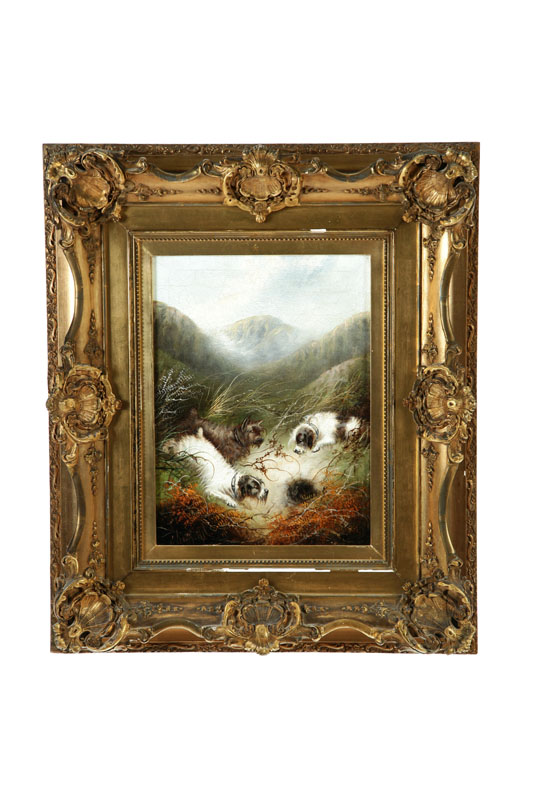 Oil on canvas, signed lower left. Three terriers in the field. Restoration. 16"h. 12"w, in a gilt frame, 28"h. 23"w.