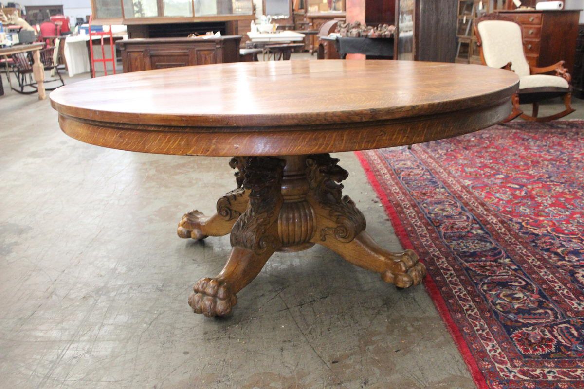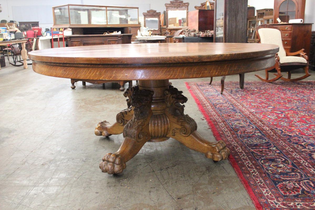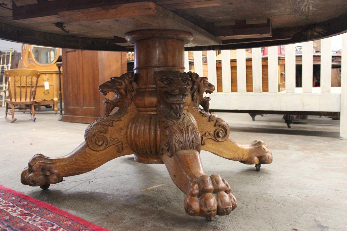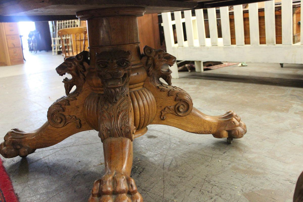 TERRIFIC ROUND OAK TABLE - MASSIVE 66" BASE - SOLID W/ GREAT LION AND FLUTED BASE