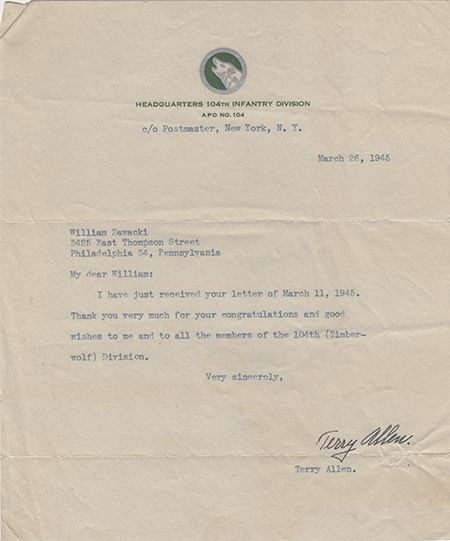 (1888 - 1969) American general, commanded the First Infantry Division in North Africa and Sicily, 1942-43, later selected to lead the 104th Infantry Division. Allen's "Big Red One" fought in North Africa and Sicily, then with the 104th he pushed through France, fought at the Bulge, and moved across the Rhine to Cologne. War-date T.L.S. on Headquarters, 10th Infantry Div. letterhead, 1p. 4to., Mar. 26, 1945 thanking a man for his "...good wishes to me and to all the members of the 104th (Timberwolf Division)...". Fine.