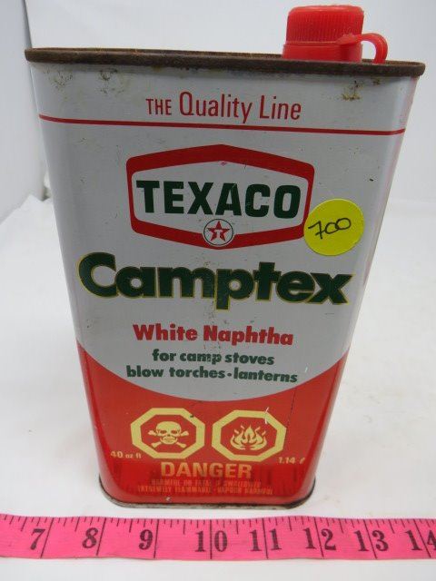 TEXACO CAMPTEX WHITE NAPTHA FOR CAMP STOVES, (TEXACO CHARCOAL LIGHTER FLUID-3/4 FULL, TEXACO NAPTHA-3/4 FULL)