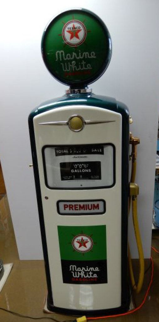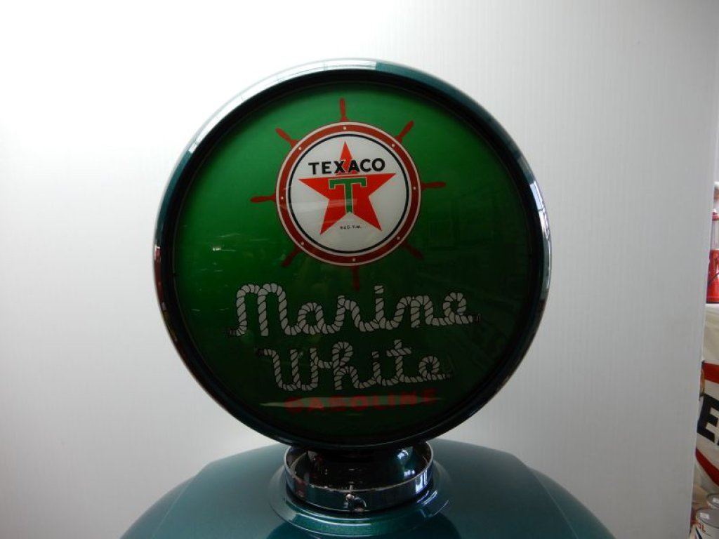 TEXACO MARINE WHITE GAS PUMP PROFESSIONALLY RESTORED - METAL BODY GLOBE - GLASS 13 1/2" LENSES - BRASS NOZZLE & CRANK LOCATION: LOWER RIGHT