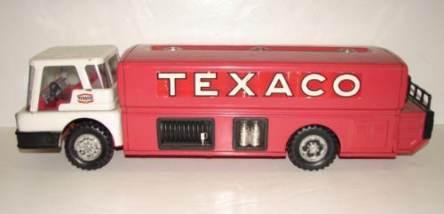 TEXACO TANKER TRUCK TOY. Pressed steel toy is marked on bottom “Park Plastics Co./Linden, N.J." Shows minor loss to paint at areas. Shows small crack to windshield. Shows a small amount of wear to labels at sides. 23" L