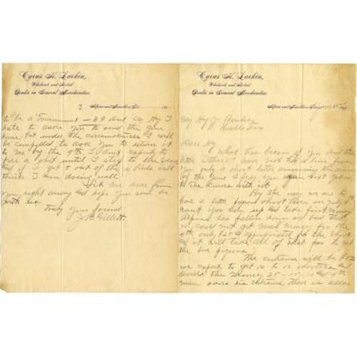 <B>FAMOUS TEXAS RANGER JAMES B. GILLETT 1899</B></I> - Gillett, James Buchanan (1856-1937) Texas Ranger, frontiersman. Gillett began cowboying around 1873 in Coleman County. He worked for several outfits, had a brush or with two Indians, saw a colleague murdered, and joined Company “D” Texas Rangers, under Captain Dan W. Roberts June 1, 1875. In late August he had his first pursuit and skirmish with hostiles (Apaches) in 1876, he joined Company "A," Frontier Battalion. In 1878 he went with a Ranger detachment to Round Rock where the notorious Sam Bass was mortally wounded. Gillett resigned as a ranger in the fall of 1881. He served as City Marshal of El Paso for several years, resigning in 1885. <B>Autographed letter signed. </B></I>Two pages, Quarto, Alpine and Marathon Texas June 22, 1899. In his hand: <I>“Dear Hy, What has become of you and the little Ithaca/ have not had a line from you only a short letter announcing the arrival of the guns…By the way we are to have a little pigeon shoot here on July 4th can't you come up and take first money. Alpine has not get much money for the 4th only $25.00 appropriated for the Show and it will take all of that to get the live pigeons…Etc.” </B></I> 8.5”x 11”. Great content Pigeon shoot; <BR><BR><B>Condition:</B></I> Fine condition, has discoloration.<BR><BR><b>Shipping:</b> Flat Material, Small (<a target="_blank" href="http://www.heritageauctions.com/common/shipping.php">view shipping information</a>)