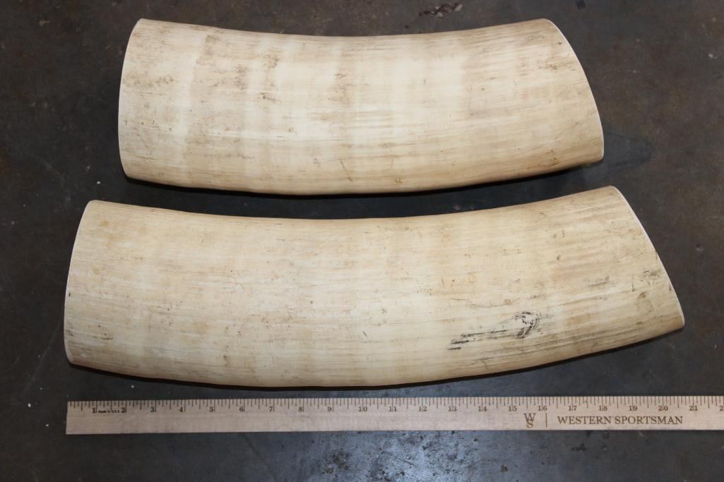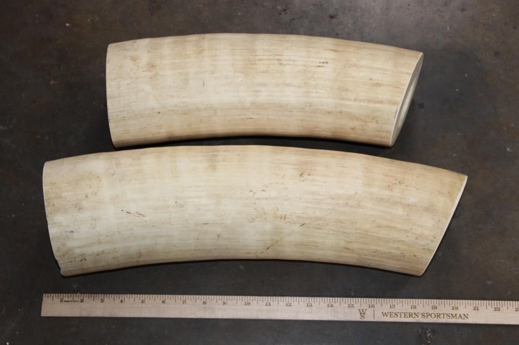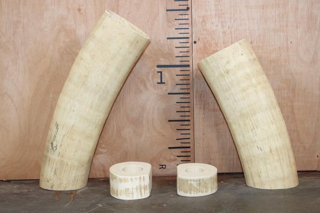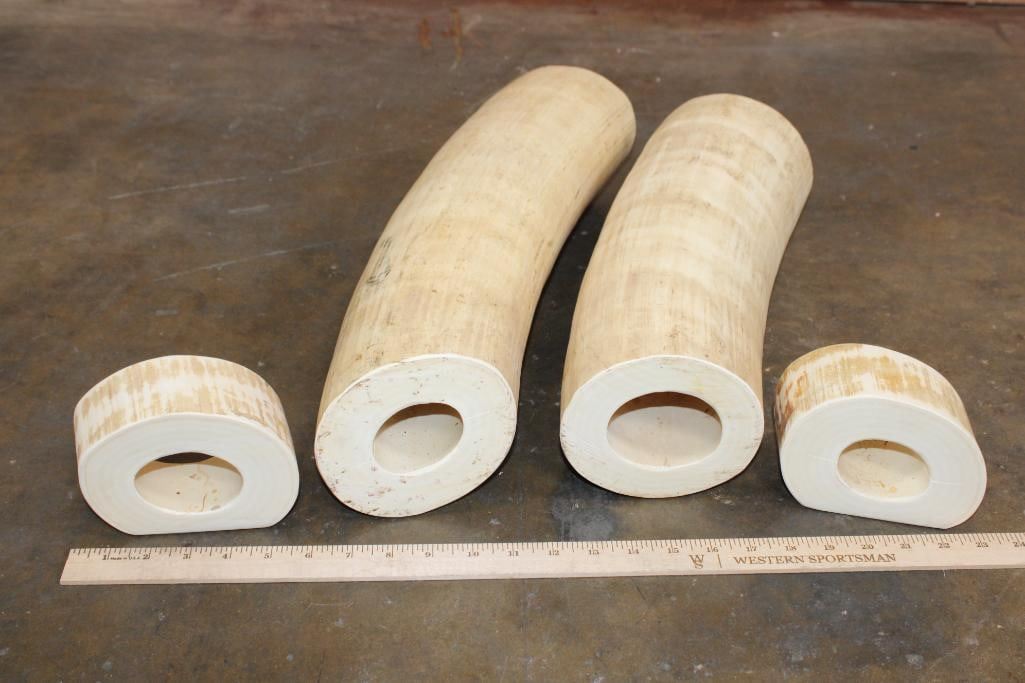 *TEXAS RESIDENTS ONLY* 4 ELEPHANT IVORY Tusk Sections. The sections measure?19 6/8" Long and 5.5" in Diameter-Weight: 10.65 lbs, 16" Long and 5 5/16 in Diameter-Weight: 7.80 lbs, 2.25" Long and 5 1/16" x 4"-Weight: 1.95 lbs, and 2" Long and 5 5/16" x 4"-Weight: 1.95 lbs. The Total Weight for all is 22.45 lbs. (ONE$) TAXIDERMY