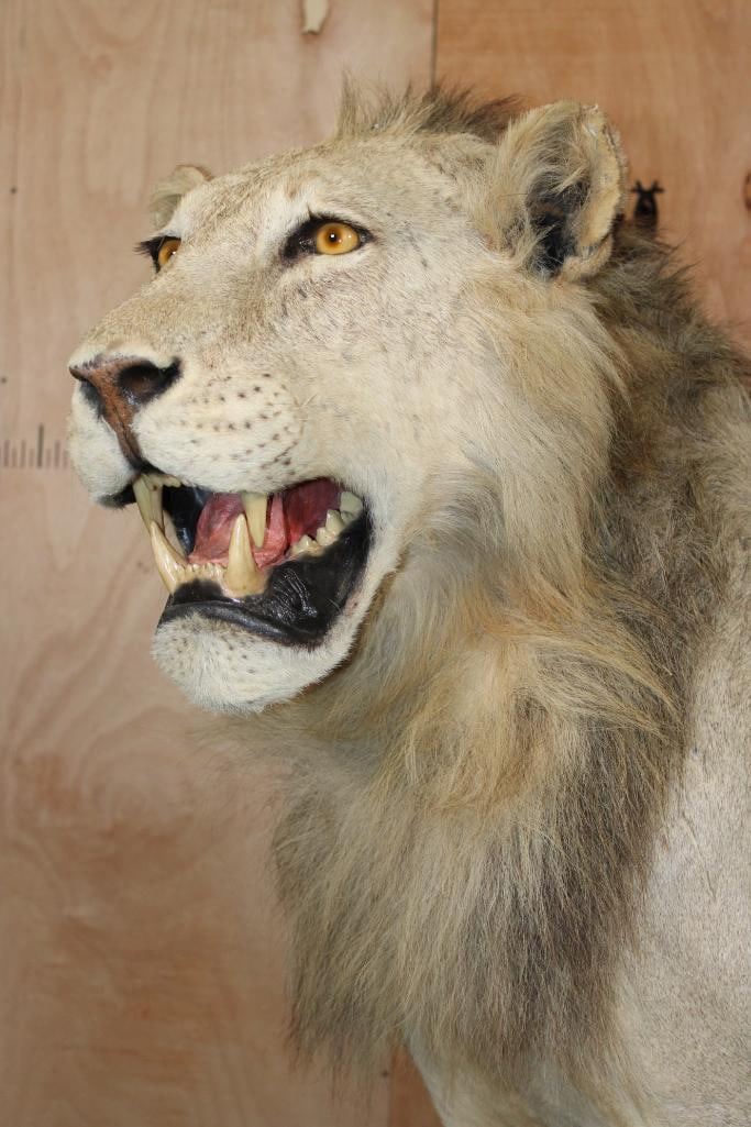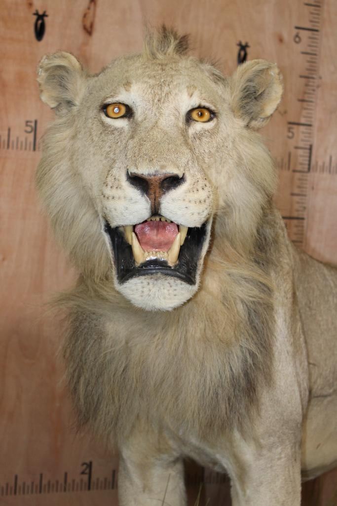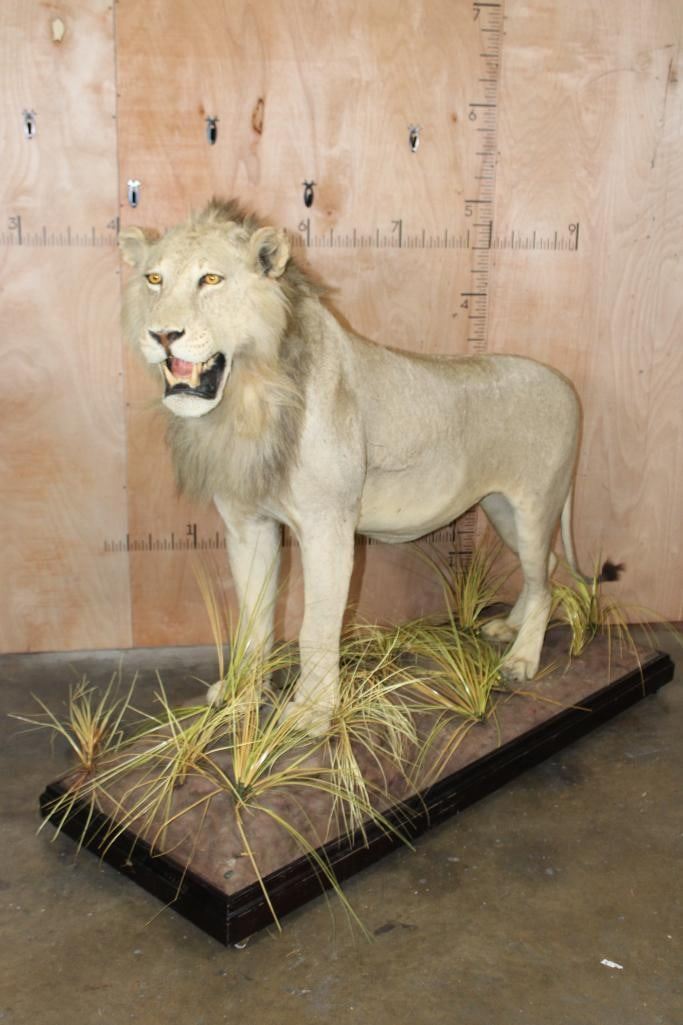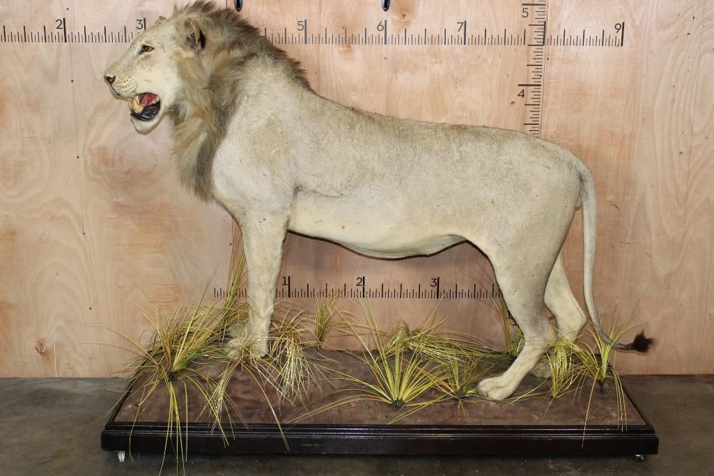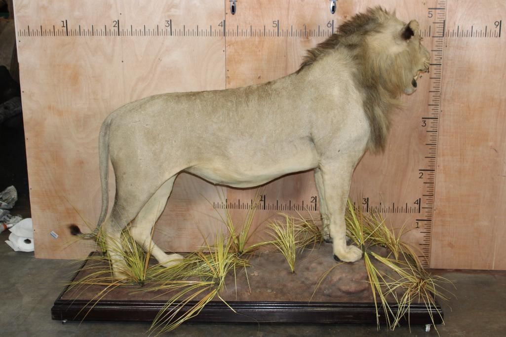 *TEXAS RESIDENTS ONLY*! Nice Life-sized AFRICAN LION. It is mounted on a Base with Wheels and measures 6' 5" Long x 28.25" Wide x 59" Tall. It has 8 Claws including 1 Dew claw. The Lion is removable from the Base and it is in Good Condition. TAXIDERMY