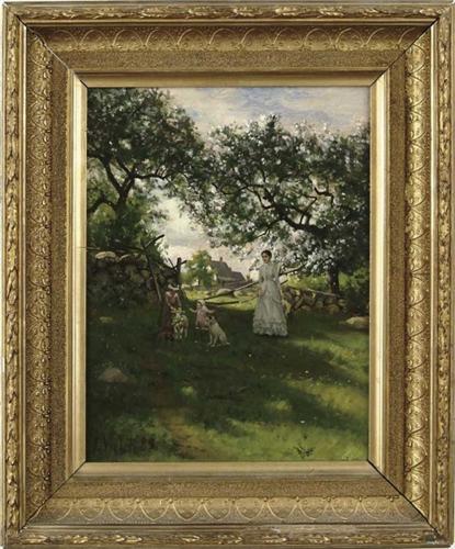 THADDEUS WELCH (American, 1844-1919) LOUIS PRANG'S DAUGHTER AND GRANDCHILDREN. Outstanding oil on board family portrait scene shows a young woman in white dress and yellow hat standing beside two daughters, one placing a wreath of flower around a small lamb and the other daughter standing next to their dog. They stand in a green grass area between two stone walls with blossoming apple trees framing a clearing which shows the family homestead. Signed lower left "T. Welch 85". Index card on back gives history of people in the painting as follows: "Rosa Prang Heinzen 1853-1943 daughters of Louis Prang wife of Karl Heinzen (son of Karl Heinzen German Rev.) With daughters Henriette 1879-1956 and Rosa Helen born 1884-1973". Housed in a fine gesso decorated period frame. PROVENANCE: Descended through the Louis Prang Family. Never offered until now. Louis Prang was one of the foremost American lithographers from the 19th Century. SIZE: 13-1/2" x 10-1/4". CONDITION: Very good. 9-27068