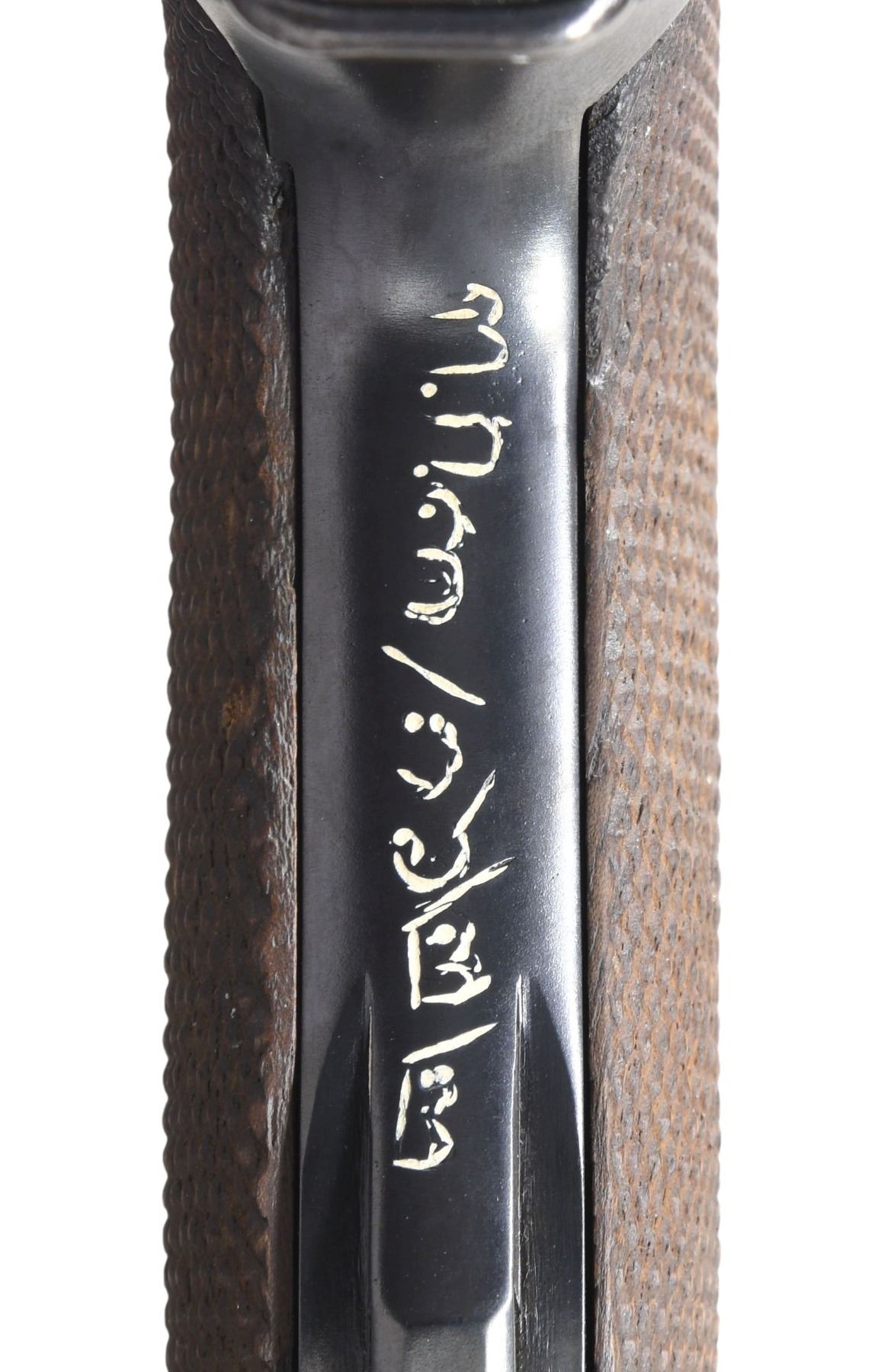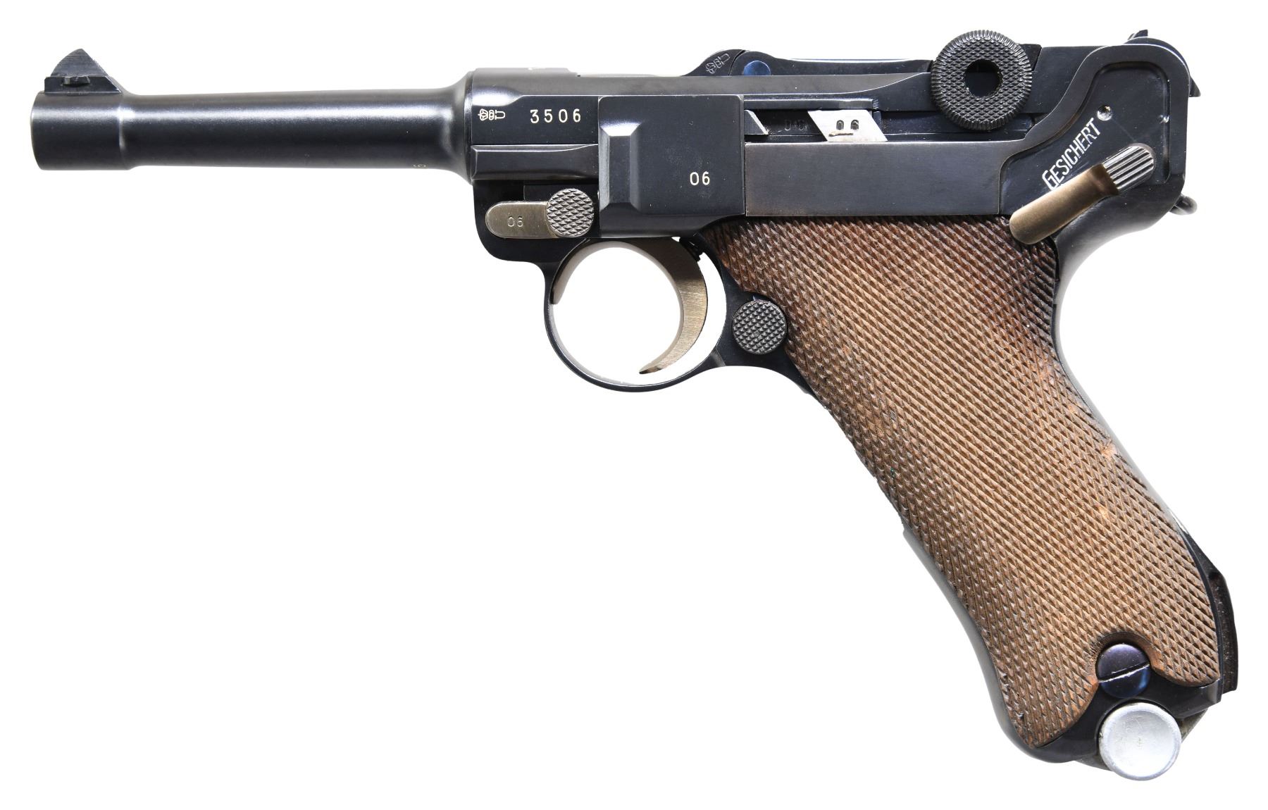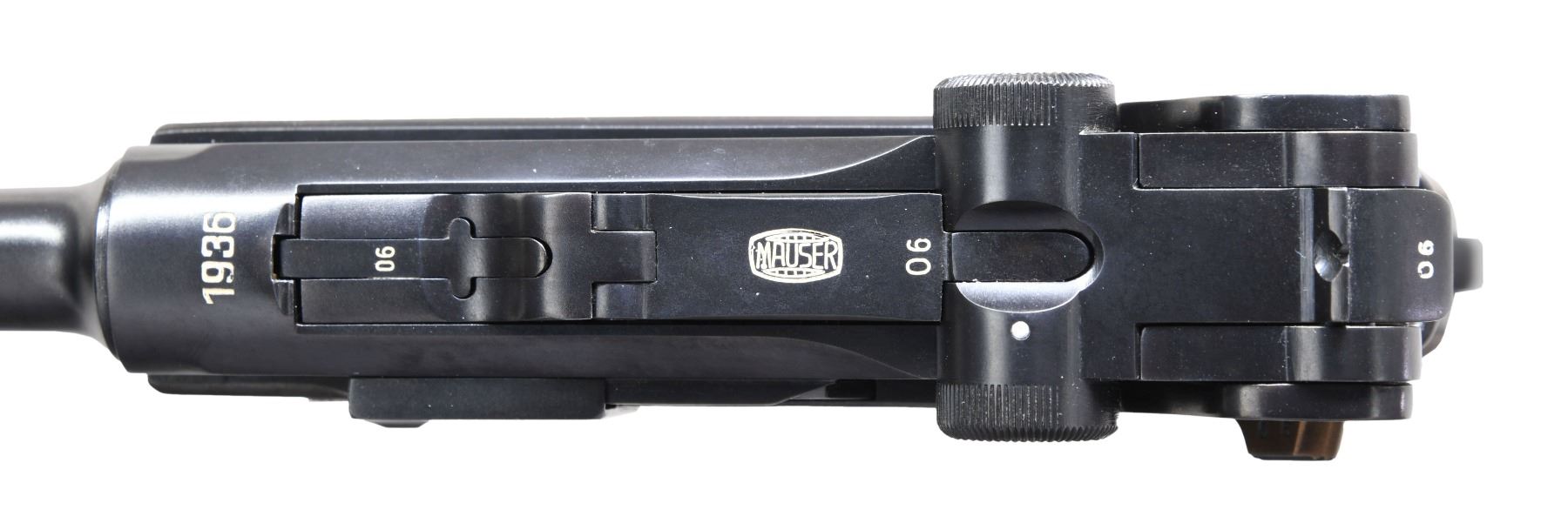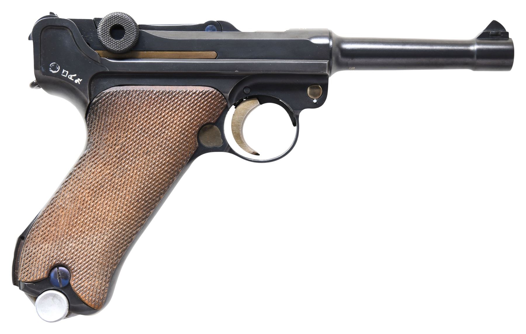 SEMI-AUTOMATIC PISTOL. Cal. 9x19mm. S# 3506v. Bbl. 4". 1 of only 350 P.08 Luger semi-automatic pistols mfg. by Mauser under contract for the Bangkok police in Thailand. The bbl. extension is marked with the 4-digit year of mfg. "1936" over the chamber, with the Mauser banner logo marked on the toggle. Left side of the bbl. extension and breechblock exhibit a double Crown/U commercial proof. Bbl. extension lug exhibits a partially discernible Mauser "S 91" proof. Right side of frame exhibits an unusually located Bangkok police Thai encircled lion head, followed by the Bangkok police property # (249) in Thai characters. Rear grip strap exhibits unusual engraved Thai characters. Metal components exhibit a professionally reapplied blue finish overall, with some small parts including the takedown lever, trigger, safety lever, and ejector exhibiting a reheated straw finish. Trigger bar exhibits a dull salt blue finish. Frame is mounted with 2-piece checkered wood grips. Dovetailed blade front sight, with fixed V-notch rear sight. All serialized parts are matching, with the S#s and commercial proofs having been enhanced at the time of restoration. Sideplate is poorly fit. MAGS: 1 blued 8-rd. mag., with aluminum bottom. S# on mag. bottom has been scrubbed, with the mag. exhibiting a "v" suffix above a properly proofed "+" and Mauser Eagle/63 proof. CONDITION: excellent, as professionally restored, with metal components retaining bountiful amounts of their reapplied blue finish, exhibiting areas of light pitting beneath the bluing. Sides of frame (beneath the grip panels) exhibit some spots of pitting. Strawed parts are excellent, as reheated. Mirror bore, as refinished, exhibiting light pitting, while retaining well defined rifling throughout. Grips show some light smoothing, as well as some superficial marks to the checkering from handling and storage, but otherwise remain sturdy and serviceable. (25-516). CURIO. $2,500-3,500.