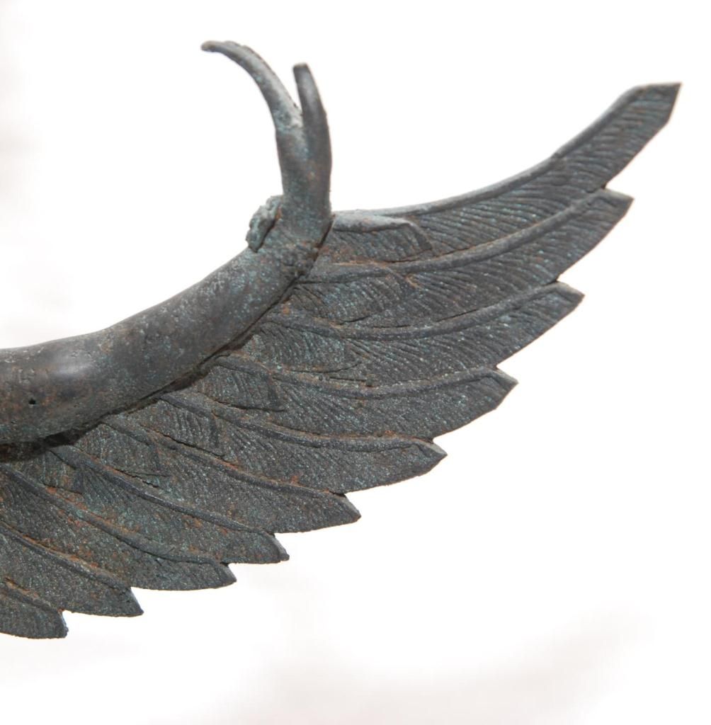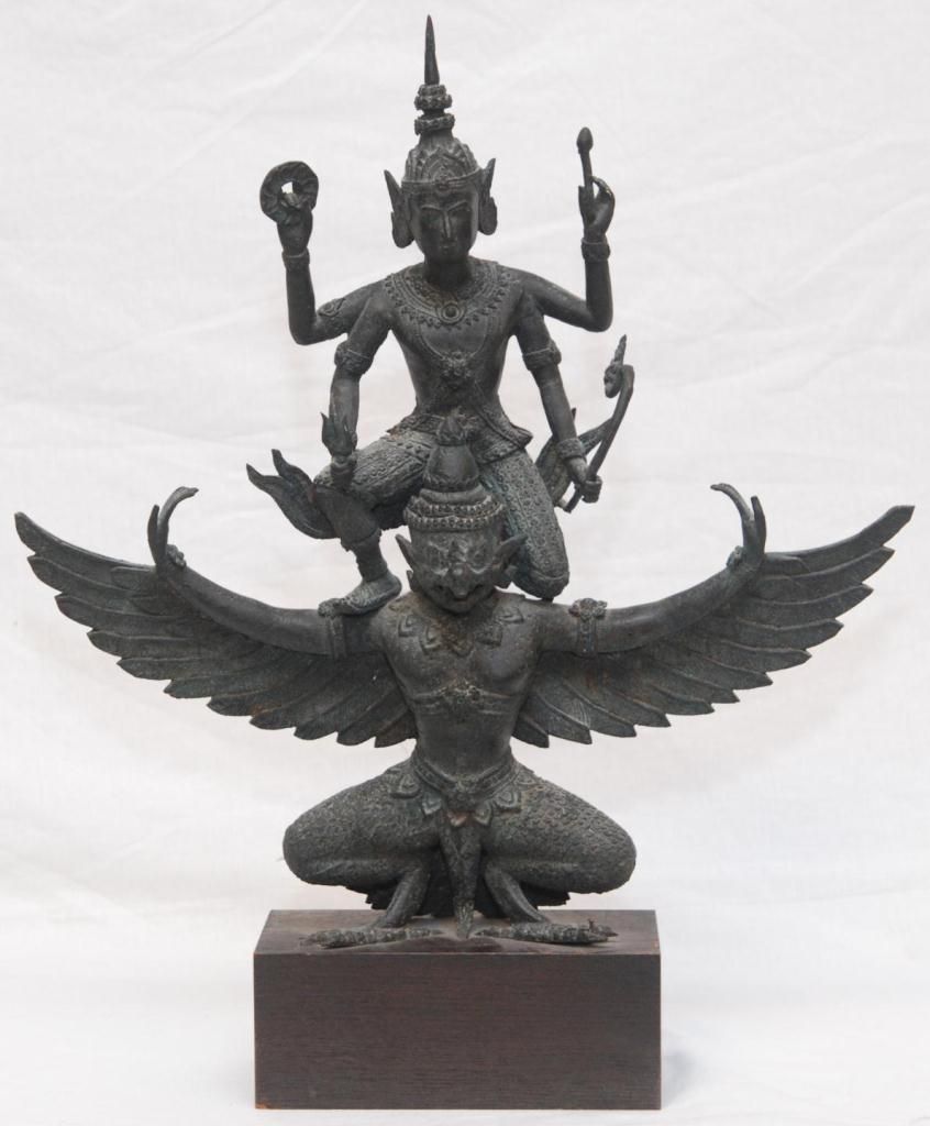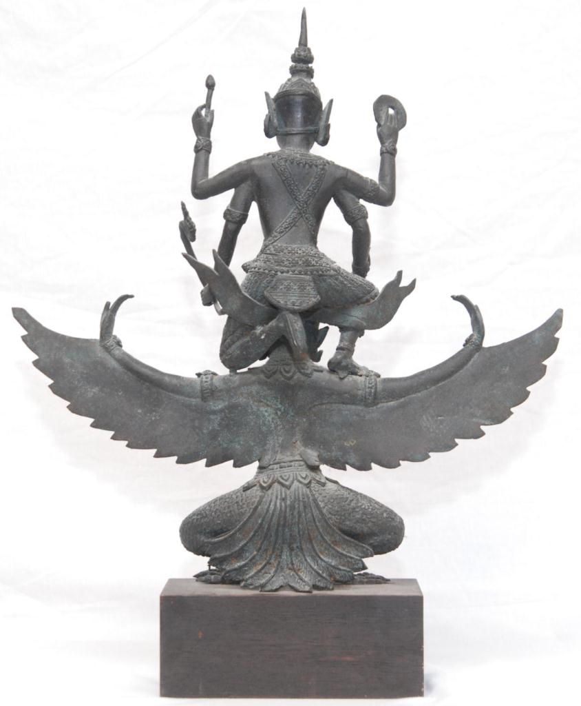 Antique Thai figural bronze sculpture depicting the Hindu god Vishnu standing on the shoulders of Garuda. 18th/19th century. Mounted to fitted wooden base. Measures 17 1/4" height + 3" base height (43.8cm + 7.6cm). Total weight of 5.54 kilograms.