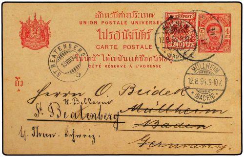 1894 BANGKOK to MULLHEIM. Stationery card of 4 atts. red, readdressed to SWITZERLAND with German stamp of 10 pf. red. Rare mixed franking.
