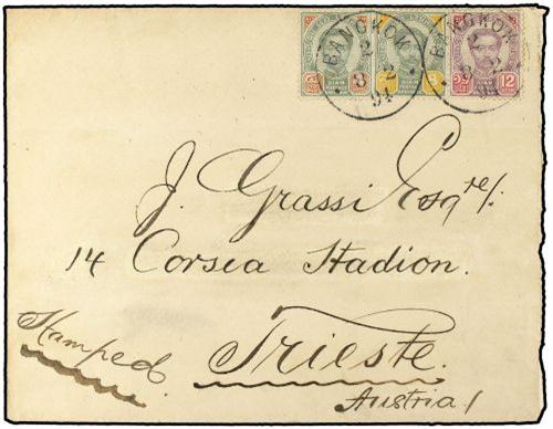 1894 Cover to AUSTRIA, franked with 4 att., 8 att. and 12 att. stamps (SG 14, 15, 16), all tied by BANGKOK-2 cds. Reverse bears TRIESTE arrival datestamp. A very fine three color third issue franking, prepaying the double letter rate to Europe.